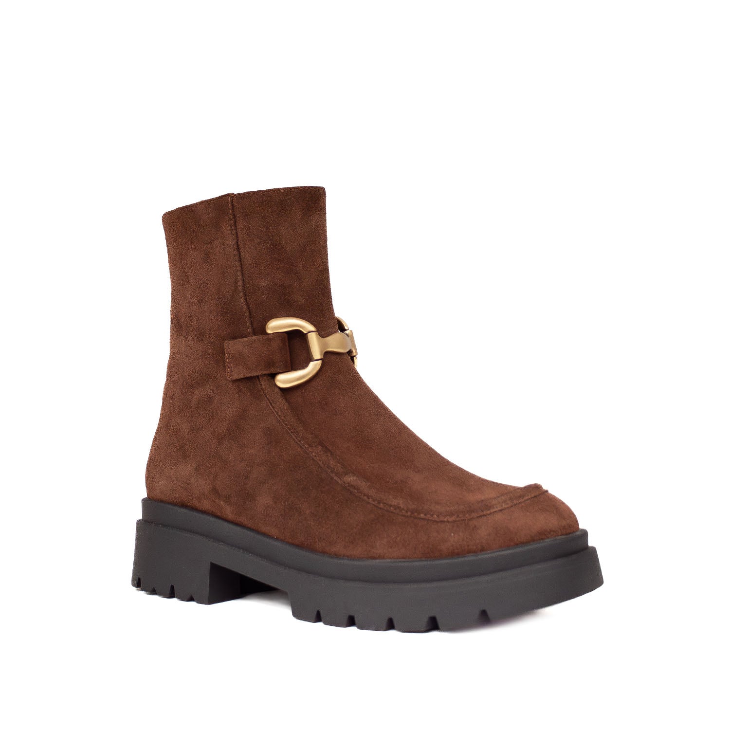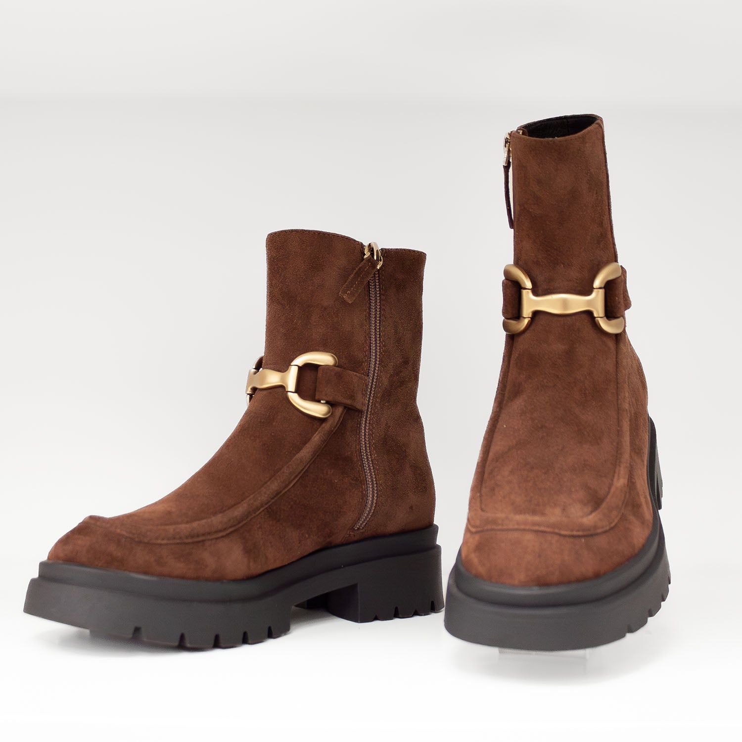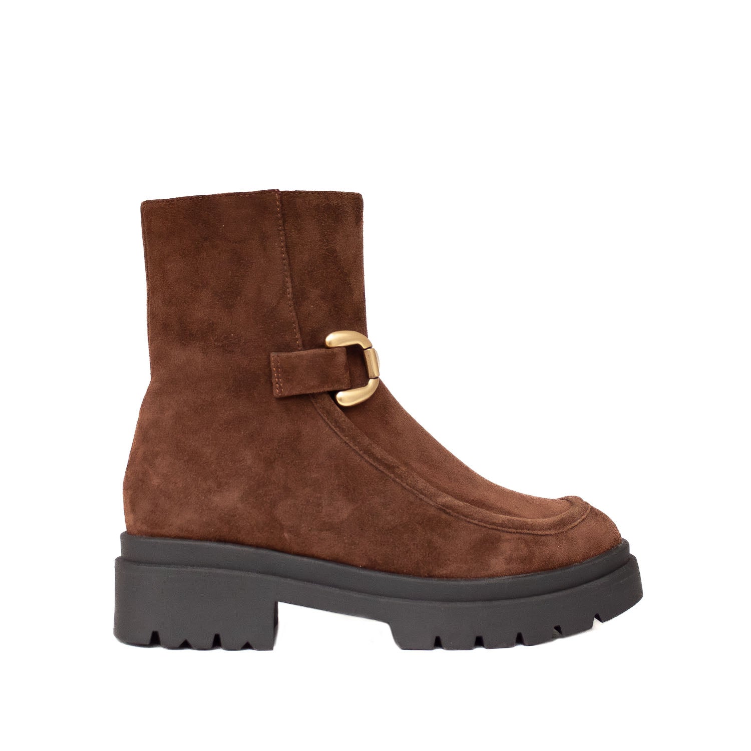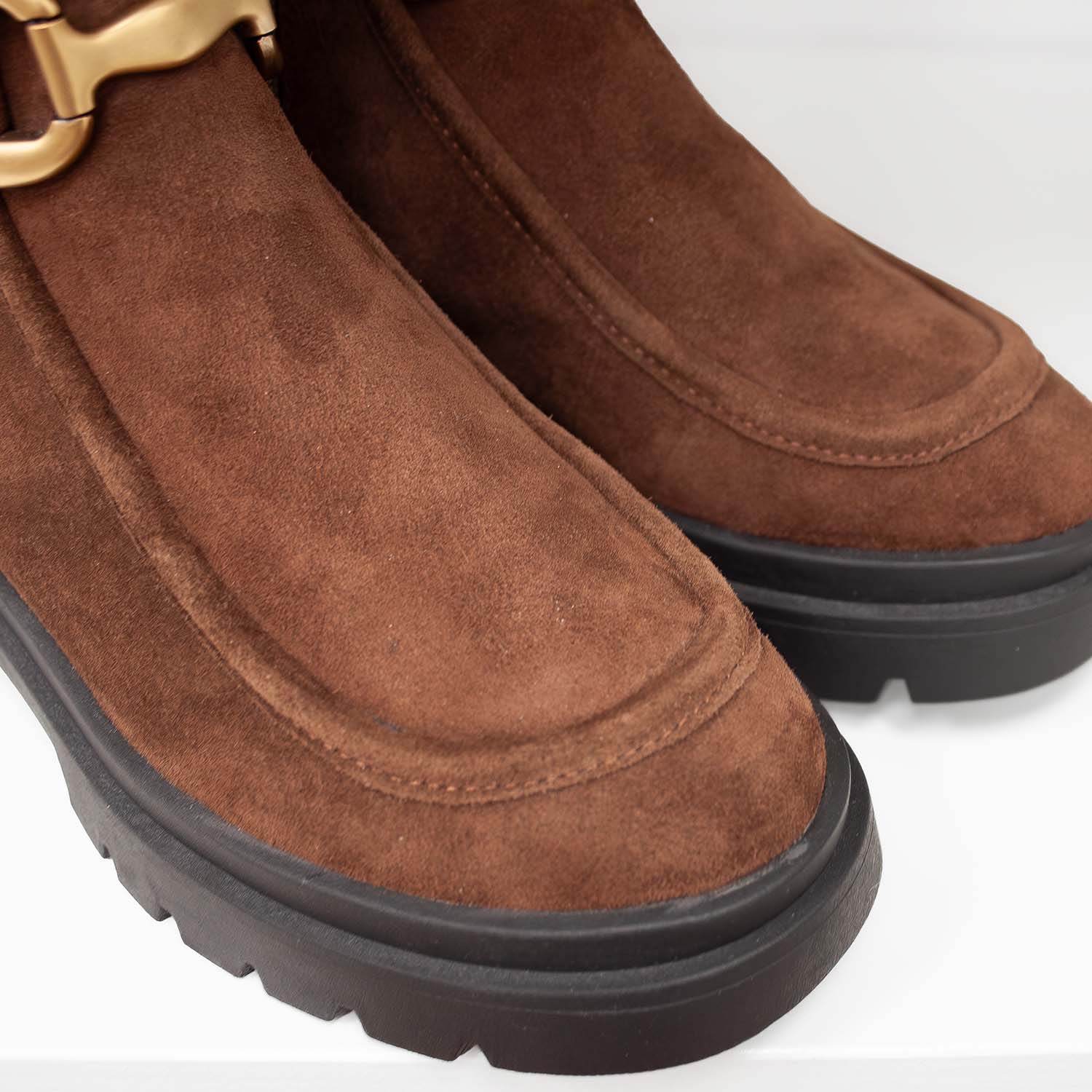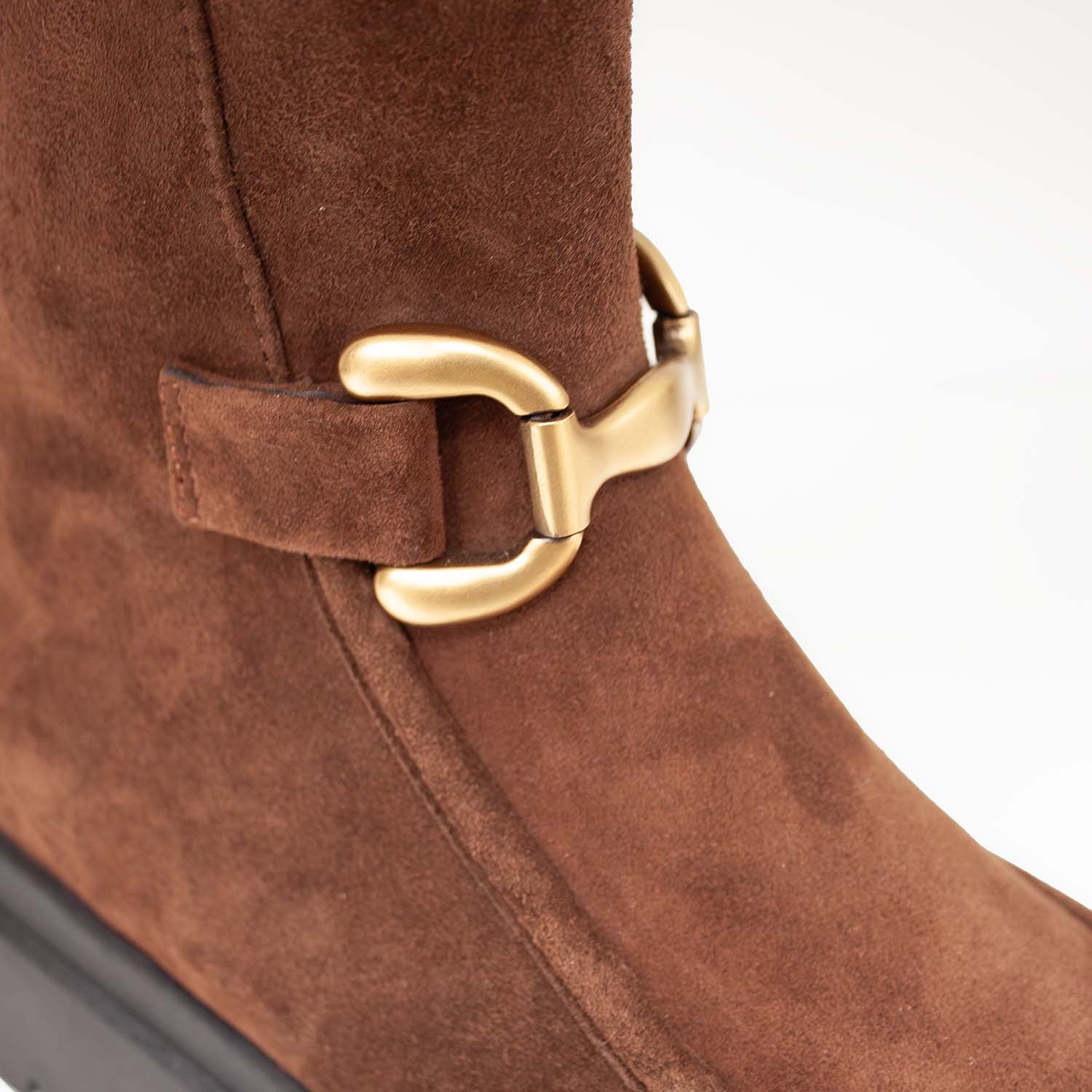 Brązowe botki hiszpańskiej marki Bibi Lou wykonane są z naturalnej skóry zamszowej o eleganckim wykończeniu. Cholewka sięgająca za kostkę posiada metalową klamrą w odcieniu starego złota, która dodaje butom wyrazistości i lekko jeździeckiego charakteru. Solidna podeszwa z wyraźnym bieżnikiem podkreśla nowoczesny styl i zapewnia wygodę w codziennym użytkowaniu. Wnętrze wykończone jest skórzaną wkładką, co zwiększa komfort noszenia. Ten hiszpański model świetnie prezentuje się z jeansami, wełnianym płaszczem czy sukienką z dzianiny, nadając stylizacjom modowego pazura i swobody.
