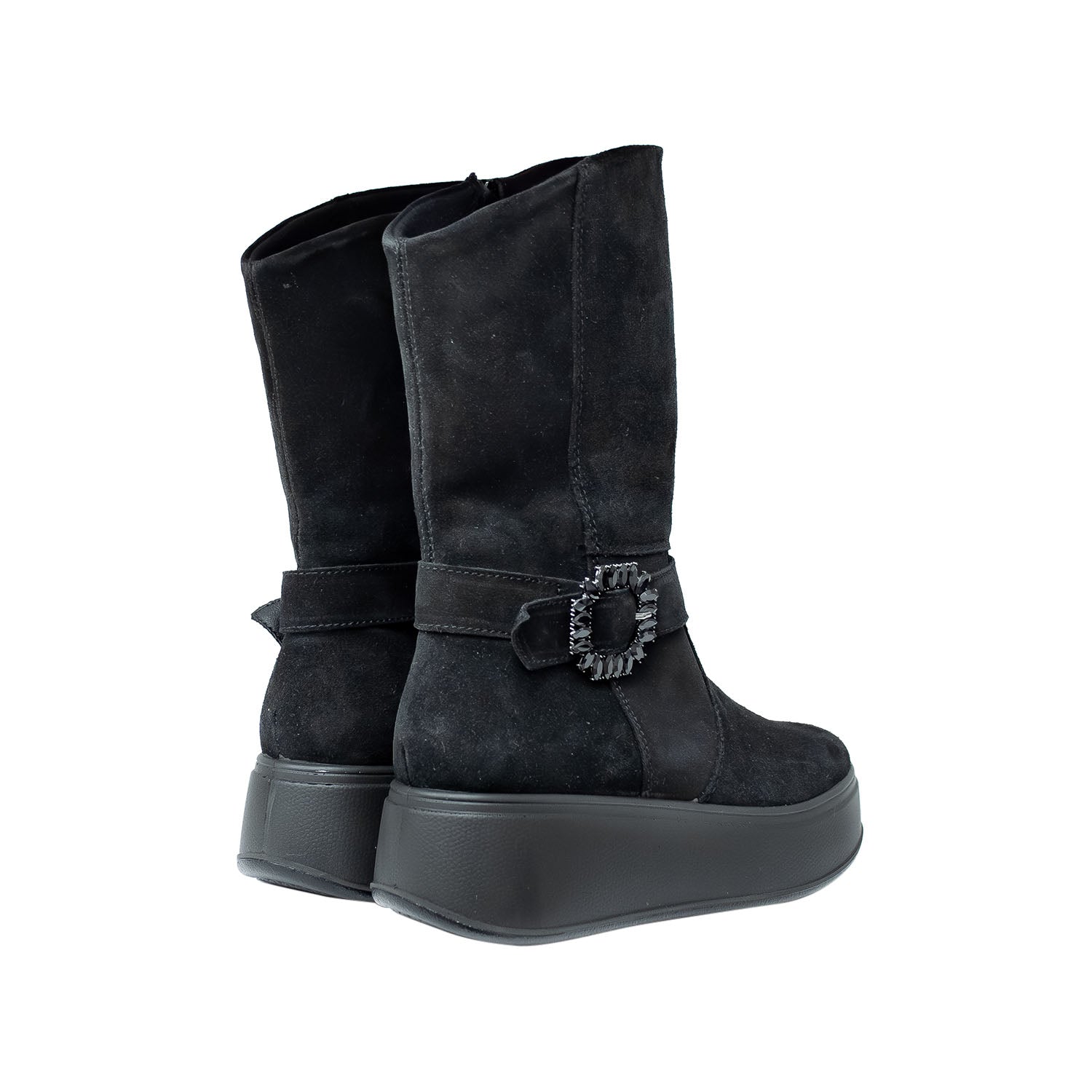 Czarne botki Igi&Co wykonane z miękkiej skóry zamszowej wyróżniają się wysoką cholewką, która optycznie wysmukla sylwetkę. Na pasku umieszczono ozdobną klamrę wysadzaną czarnymi kryształkami, nadającą im eleganckiego blasku. Stabilna platforma zapewnia wygodę na co dzień, a ocieplane wnętrze z polarem otula stopę w chłodniejsze dni. Skórzana wkładka podnosi komfort noszenia, a całość utrzymana jest w wyważonym, kobiecym stylu. Doskonale komponują się z dopasowanymi spodniami i swetrem, ale też z dzianinową sukienką.