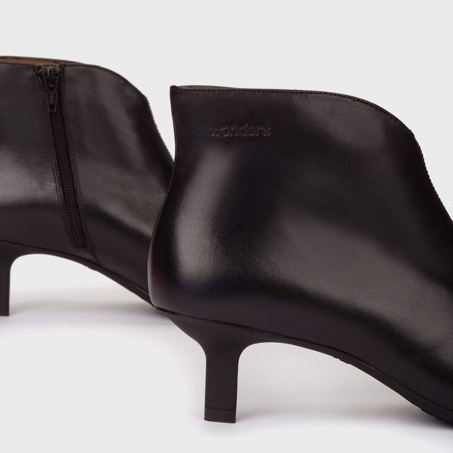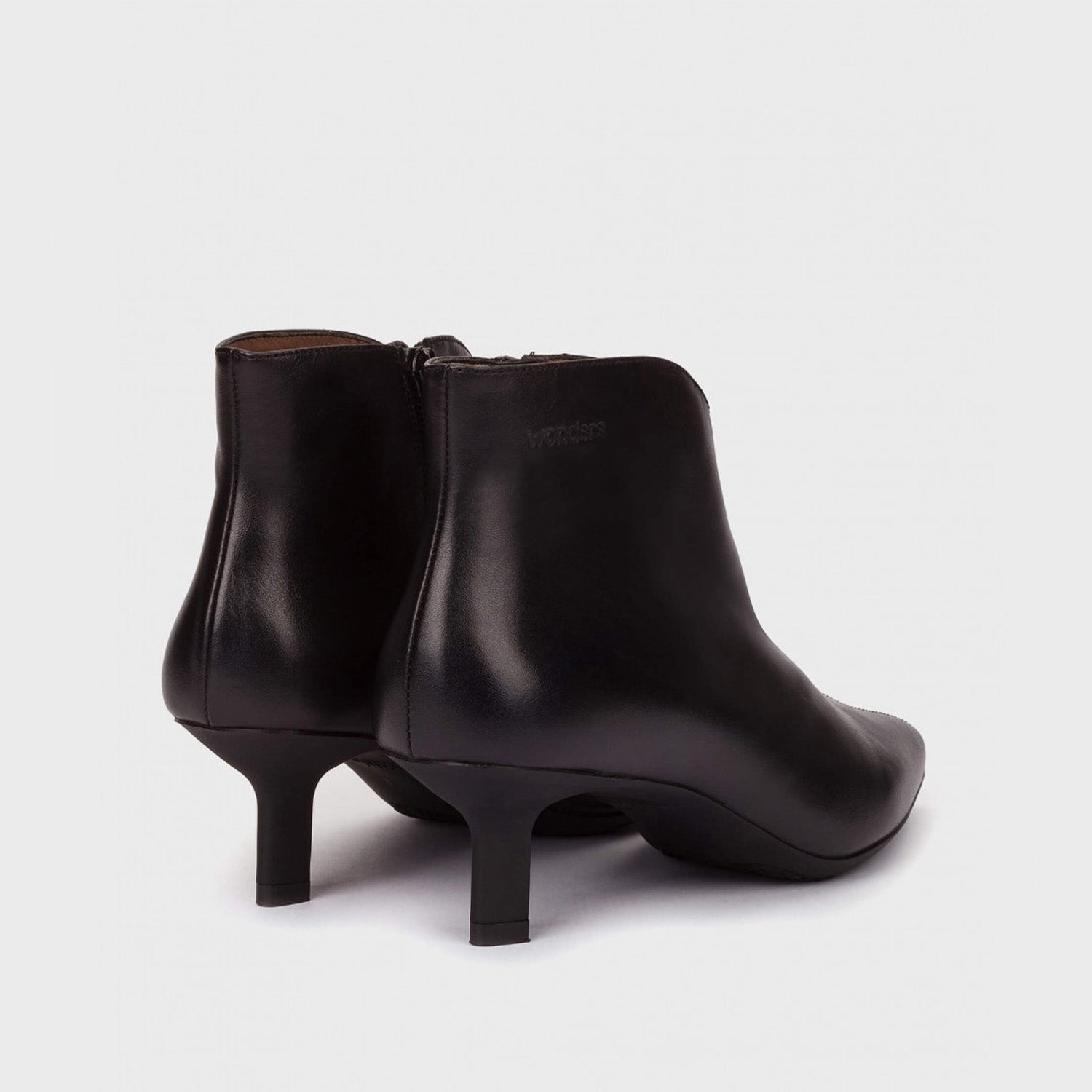Czarne botki Wonders wykonane z gładkiej skóry naturalnej to model o subtelnie wydłużonej linii i kobiecym charakterze. Delikatna szpilka typu kaczuszka nadaje im lekkości i sprawia, że noszą się wyjątkowo wygodnie. Smukła cholewka z bocznym zamkiem pięknie układa się na nodze, a spiczasty nosek dodaje elegancji. Wnętrze wyściełane zostało wkładką MemoryGel, która otula stopę miękkim komfortem. To botki idealne do spódnic i wąskich spodni, gdy chcesz dodać stylizacji wyrafinowanego akcentu.