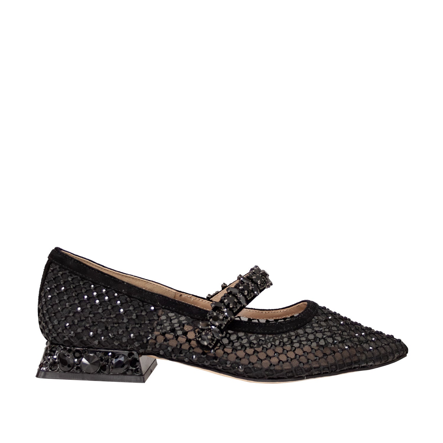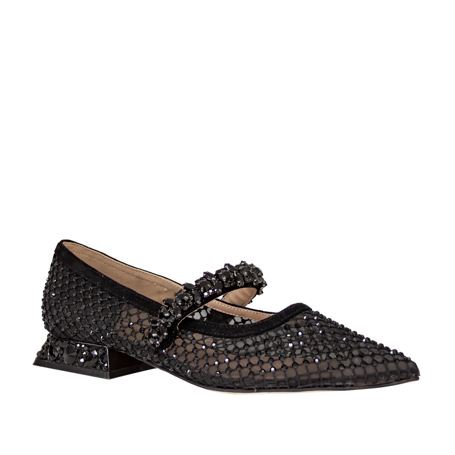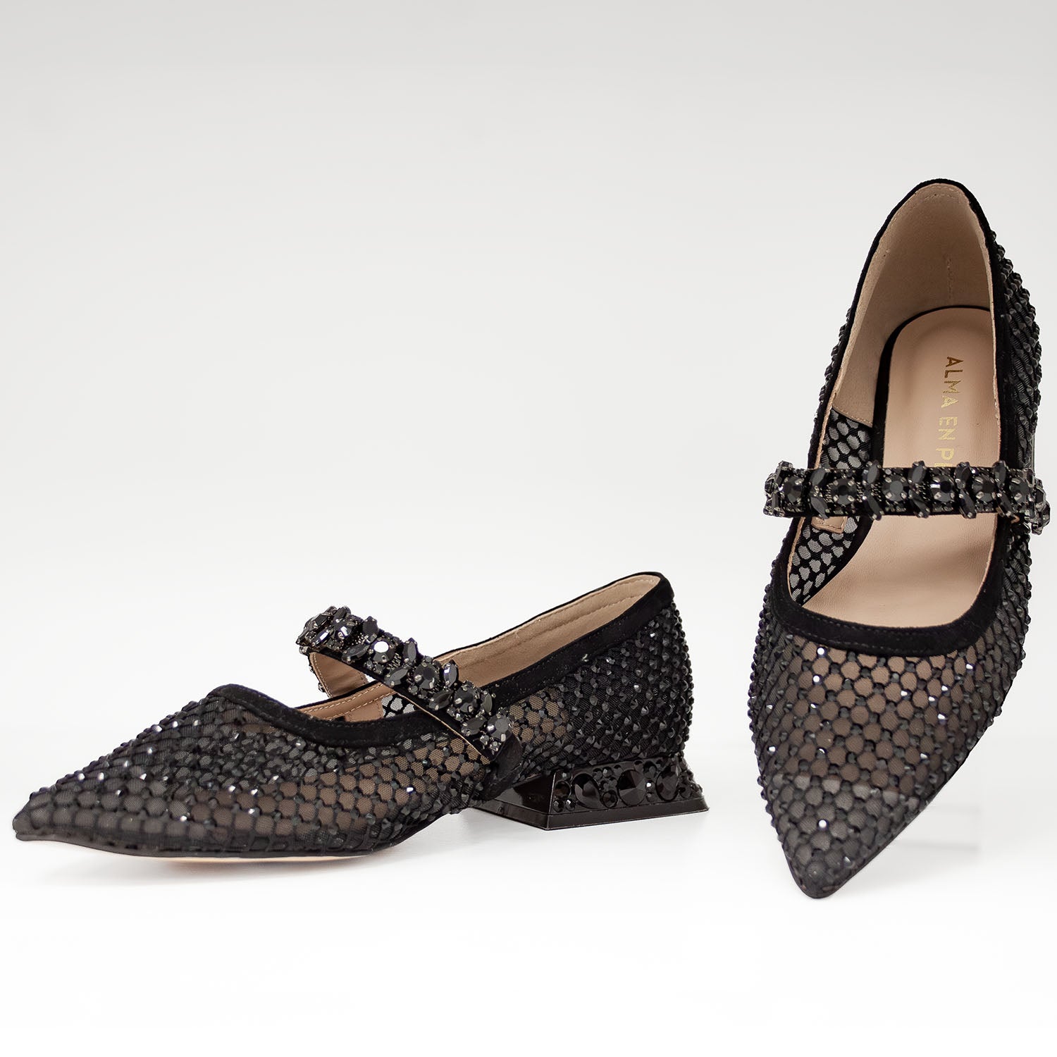 Czarne czółenka na niskim obcasie Alma En Pena wykonane są z miękkiej, elastycznej siateczki ozdobionej drobnymi kryształkami, które subtelnie migoczą przy każdym ruchu oraz najwyższej jakości skóry naturalnej. Smukły nosek w szpic podkreśla elegancki kształt stopy, a pasek z błyszczącymi kamieniami dodaje biżuteryjnego charakteru. Stabilny obcas także został ozdobiony, dzięki czemu czółenka prezentują się wyjątkowo lekko i stylowo. Wnętrze wyściełane naturalną skórą zapewnia wygodę noszenia przez cały dzień. Ten model idealnie uzupełni wieczorowe stylizacje – od klasycznej małej czarnej po satynowe spodnie lub dopasowaną spódnicę midi.