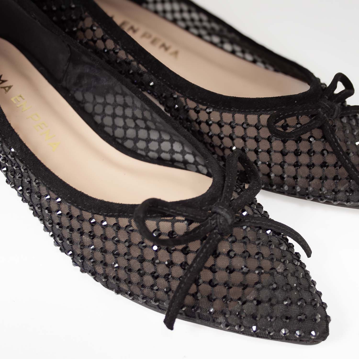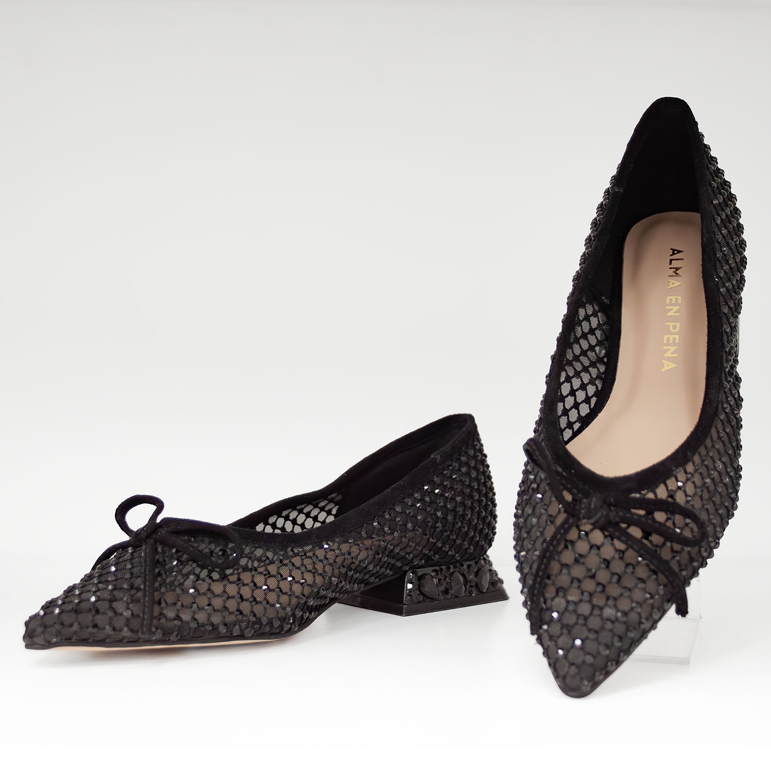 Czarne czółenka na niskim obcasie Alma En Pena zachwycają kobiecym wdziękiem i subtelnym blaskiem. Miękka siateczka zdobiona drobnymi cyrkoniami delikatnie otula stopę, a niewielka kokardka przy nosku dodaje im lekkości i eleganckiego charakteru. Także stabilny obcas typu klocek został ozdobiony błyszczącymi kamieniami. Wnętrze wykonane z naturalnej skóry gwarantuje komfort przez wiele godzin noszenia. Te hiszpańskie czółenka idealnie sprawdzą się w wieczorowych stylizacjach z czarną sukienką, satynową spódnicą lub eleganckimi cygaretkami.