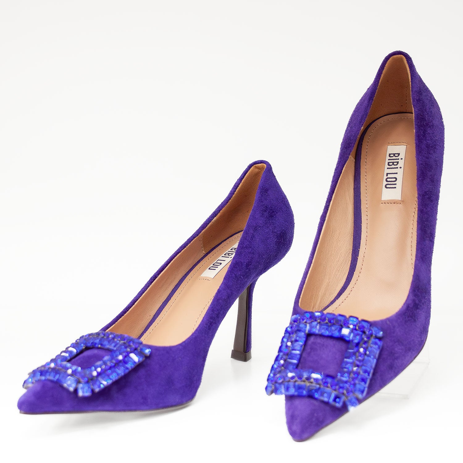 Hiszpańskie czółenka Bibi Lou w intensywnym fioletowym kolorze to efektowna propozycja dla kobiet, które lubią wyróżniać się detalem. Miękka cholewka z naturalnego zamszu pięknie komponuje się z dużą broszką z niebieskimi kryształkami, umieszczoną w przedniej części buta. Wysoki obcas dodaje sylwetce lekkości i elegancji. Skórzana wyściółka i wkładka zapewniają komfort podczas noszenia. Idealne do stylizacji wieczorowych, koktajlowych sukienek lub prostych garniturów w kontrastowych barwach.