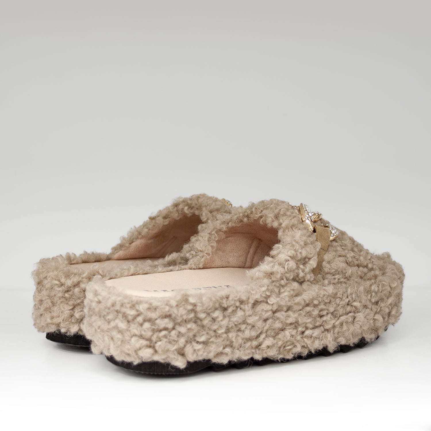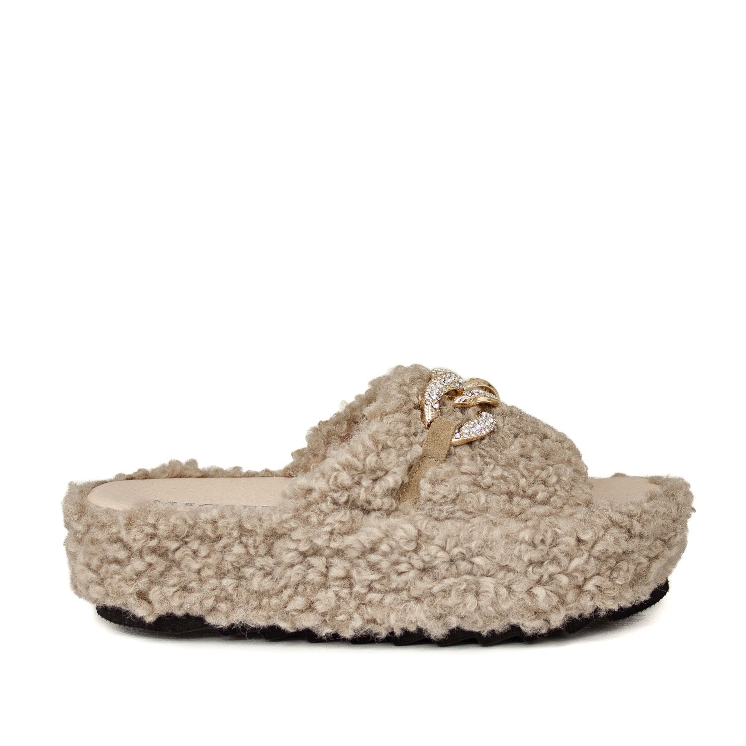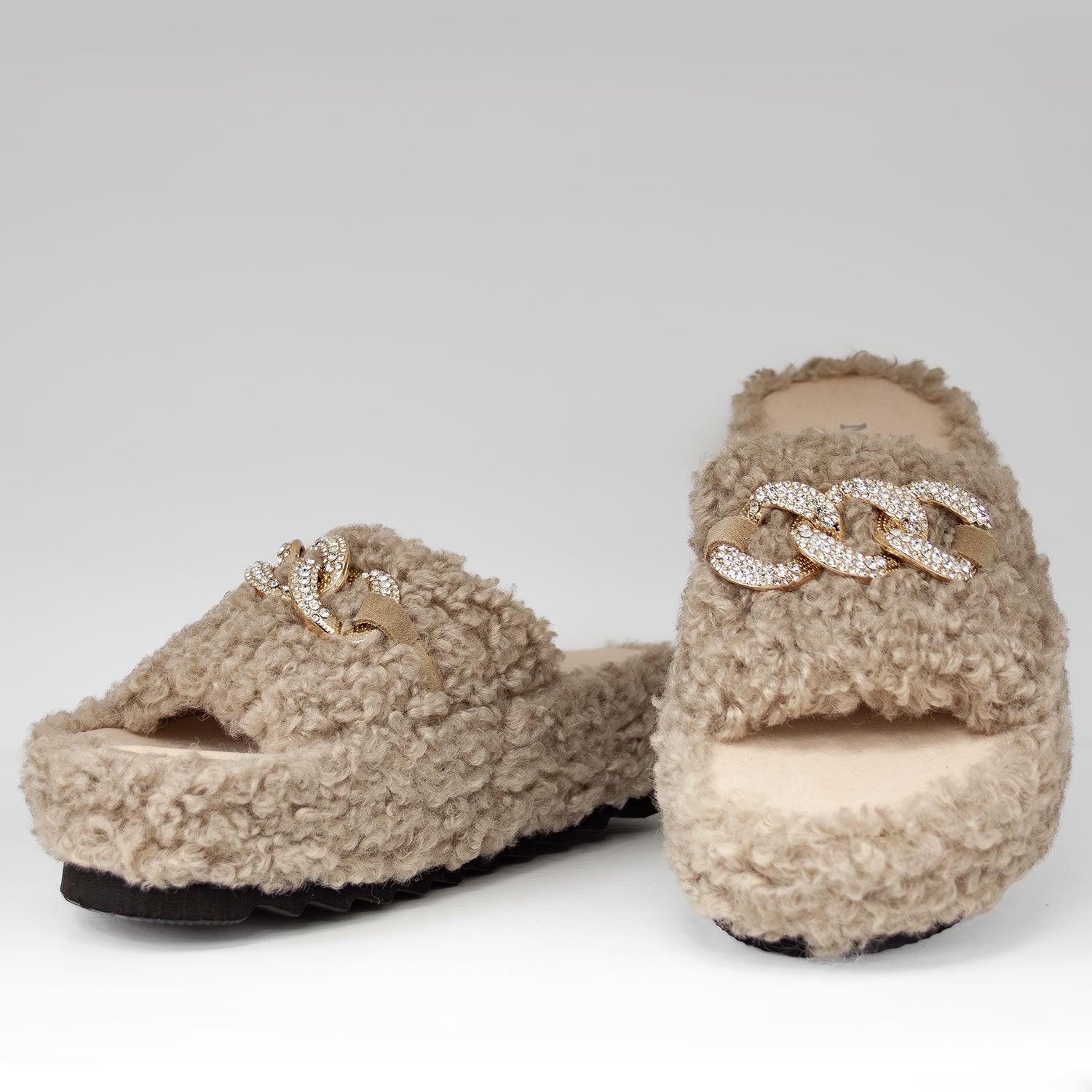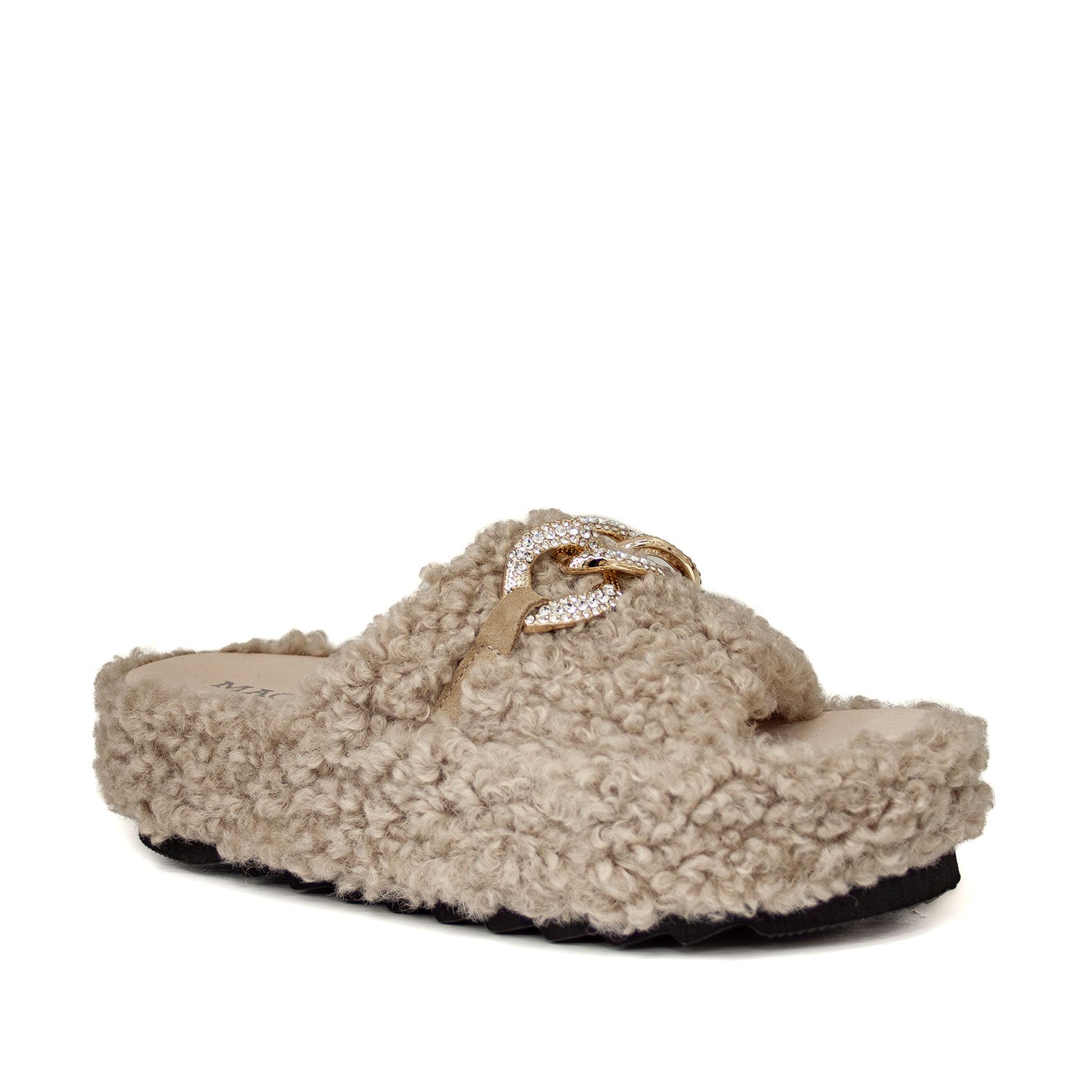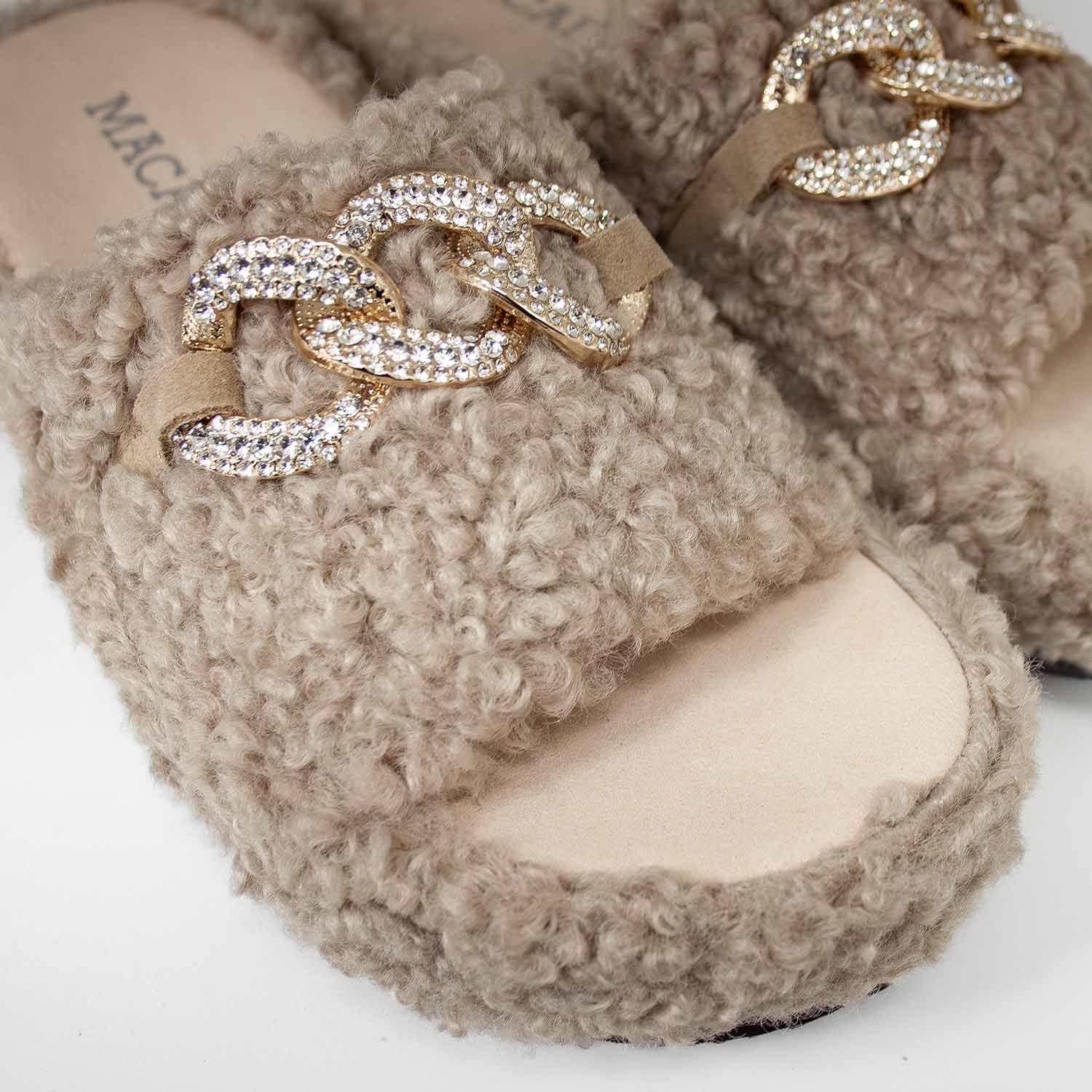 Beżowe kapcie z futerkiem hiszpańskiej marki Macarena wyróżniają się miękką, „barankową” fakturą, która nadaje im ciepły, przyjemny wygląd. Na skórzanym pasku umieszczono złotą ozdobę wysadzaną cyrkoniami, dzięki której model zyskuje elegancki, biżuteryjny akcent. Lekka platforma dodaje im wysokości, a jednocześnie pozostaje wygodna na co dzień. Idealne domowe kapcie dla osób lubiących przytulny styl z nutą luksusu.