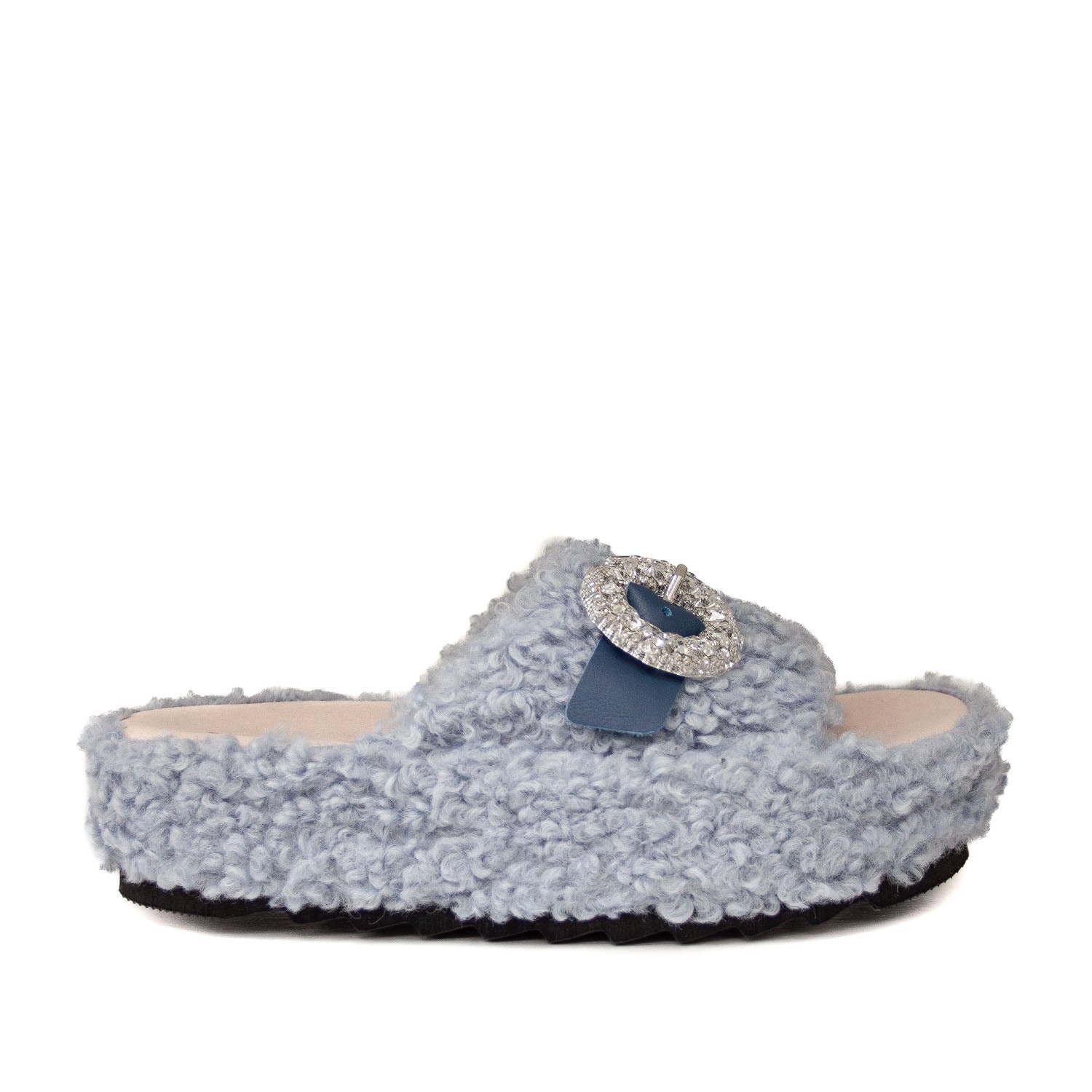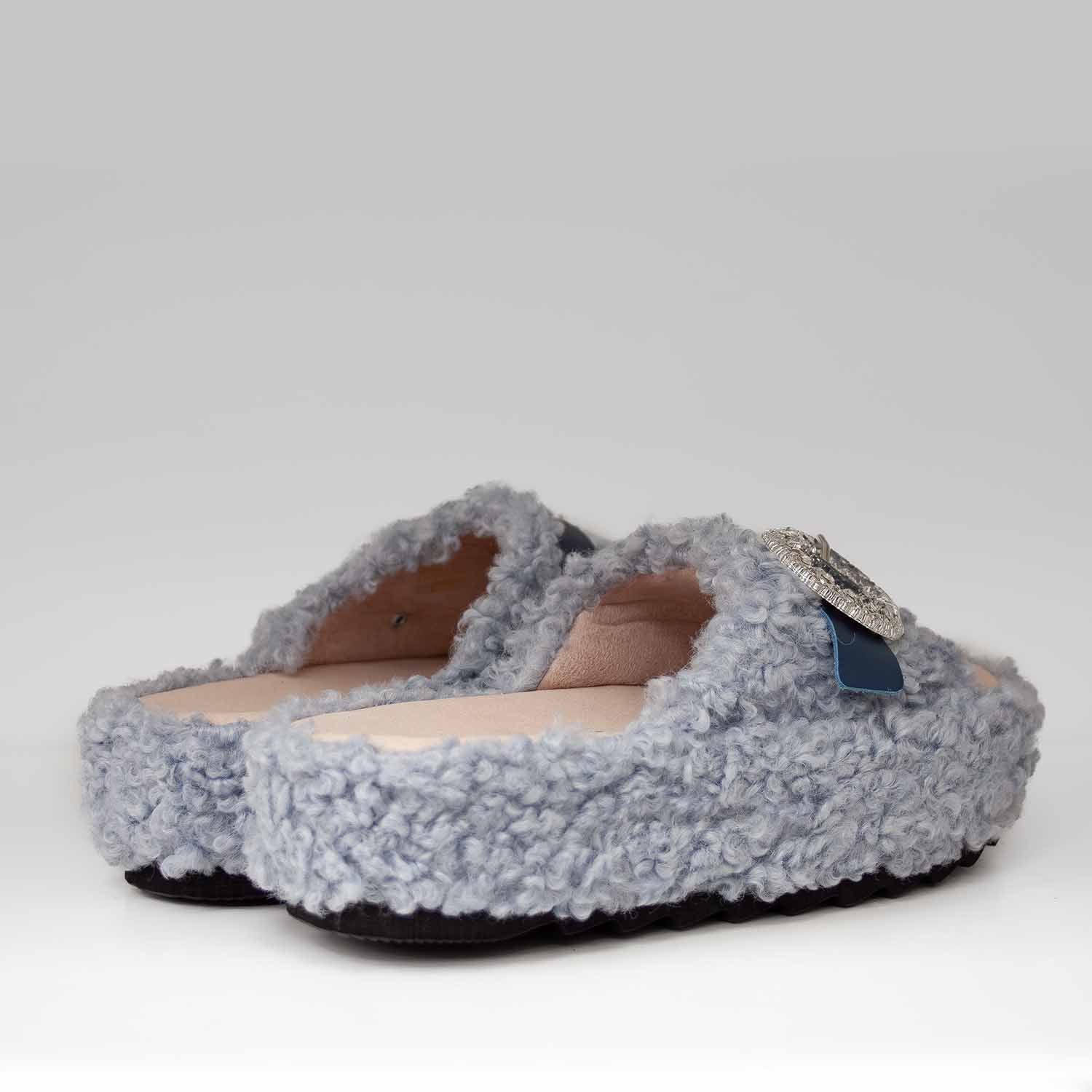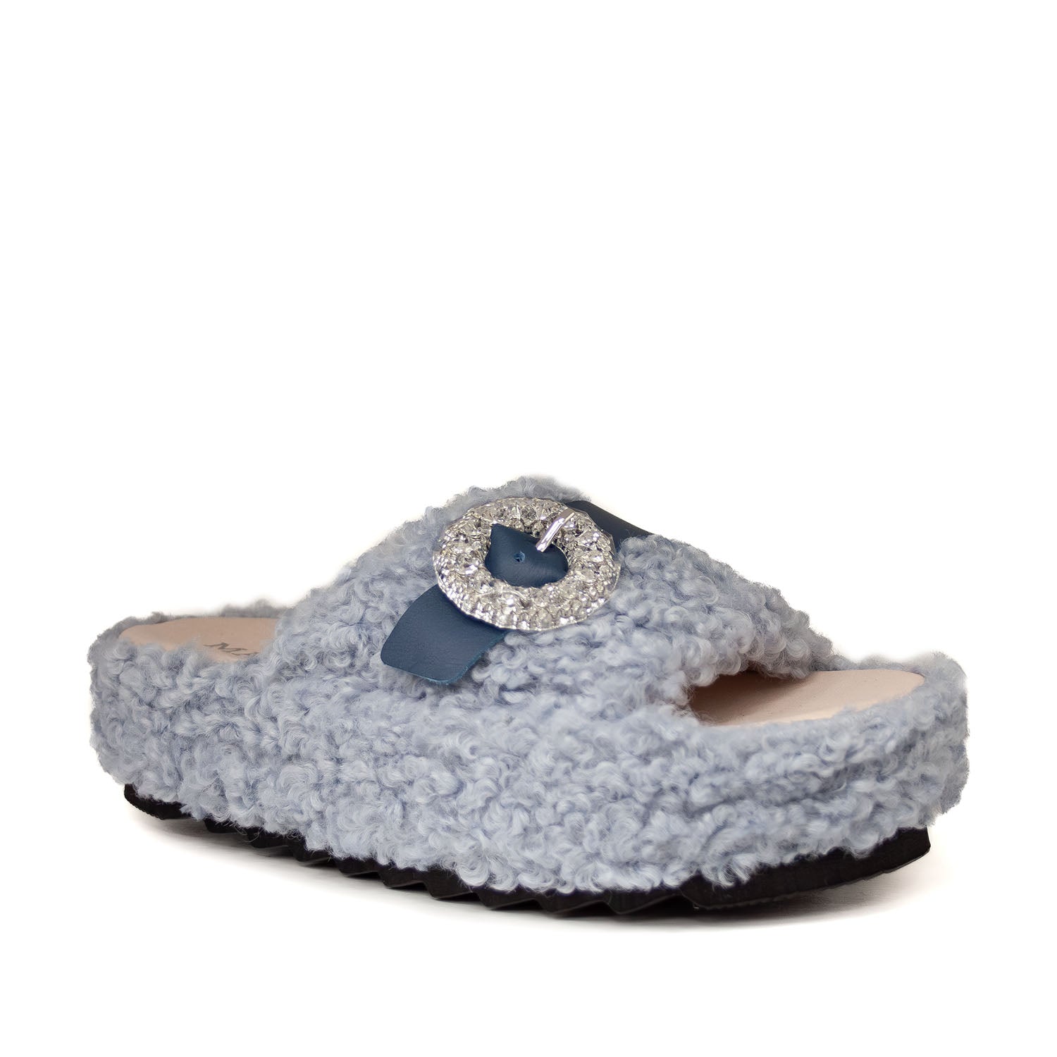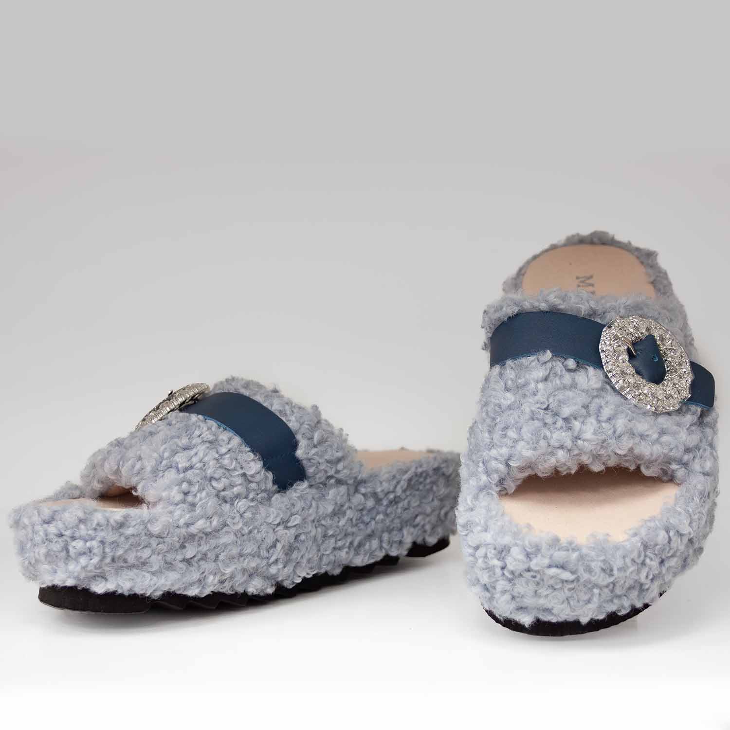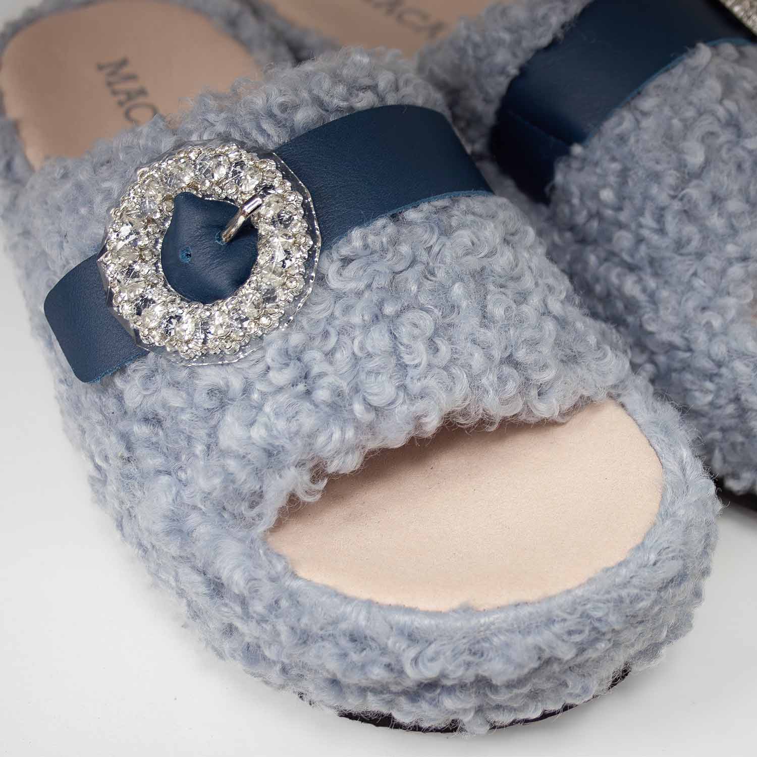 Niebieskie kapcie Macarena wyróżniają się miękką fakturą przypominającą owcze futerko oraz wyraźnie podwyższoną, lekką platformą. Głęboki granatowy pasek z dużą, biżuteryjną klamrą nadaje im eleganckiego charakteru. Te domowe klapki są niezwykle miękkie, przyjemne w noszeniu i świetnie prezentują się jako stylowe kapcie domowe w wersji premium.