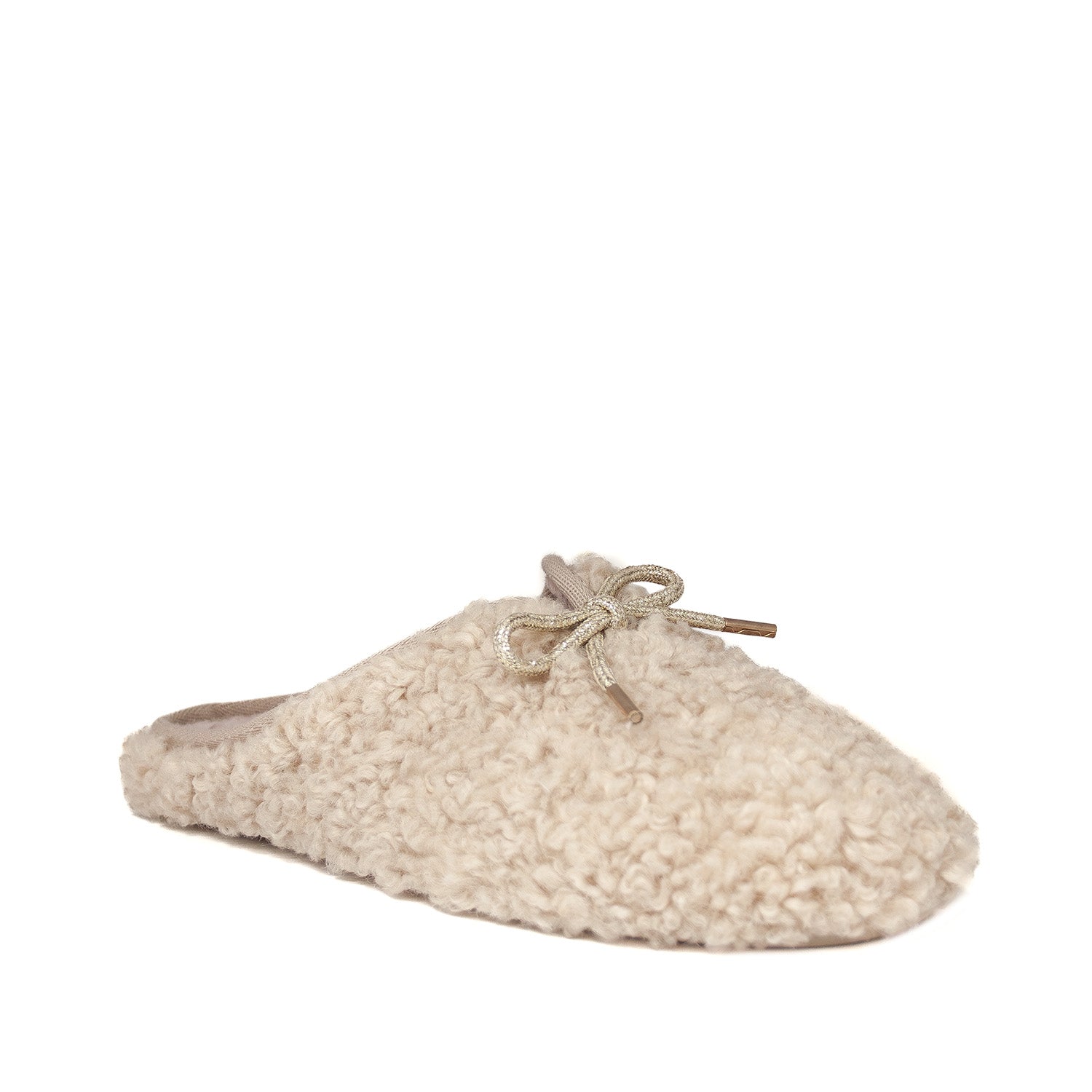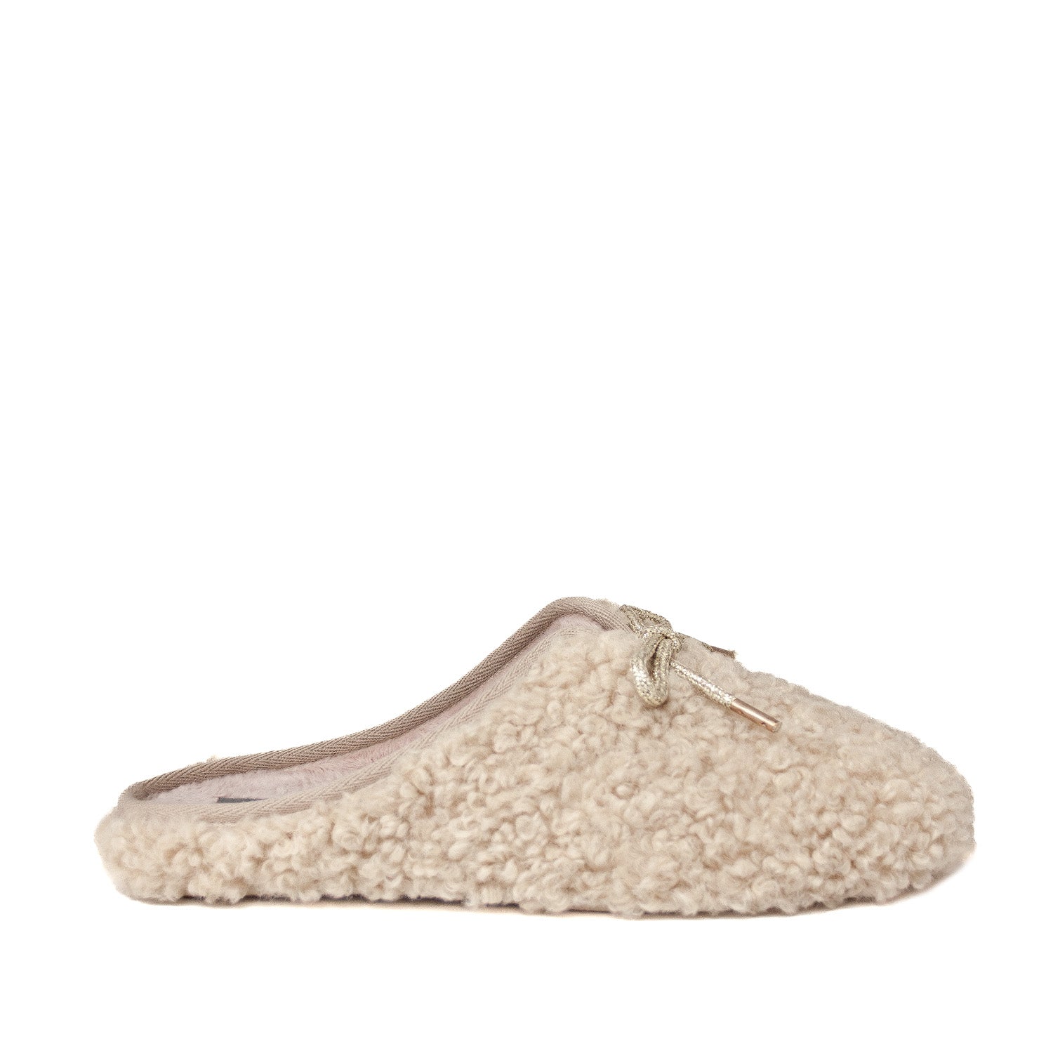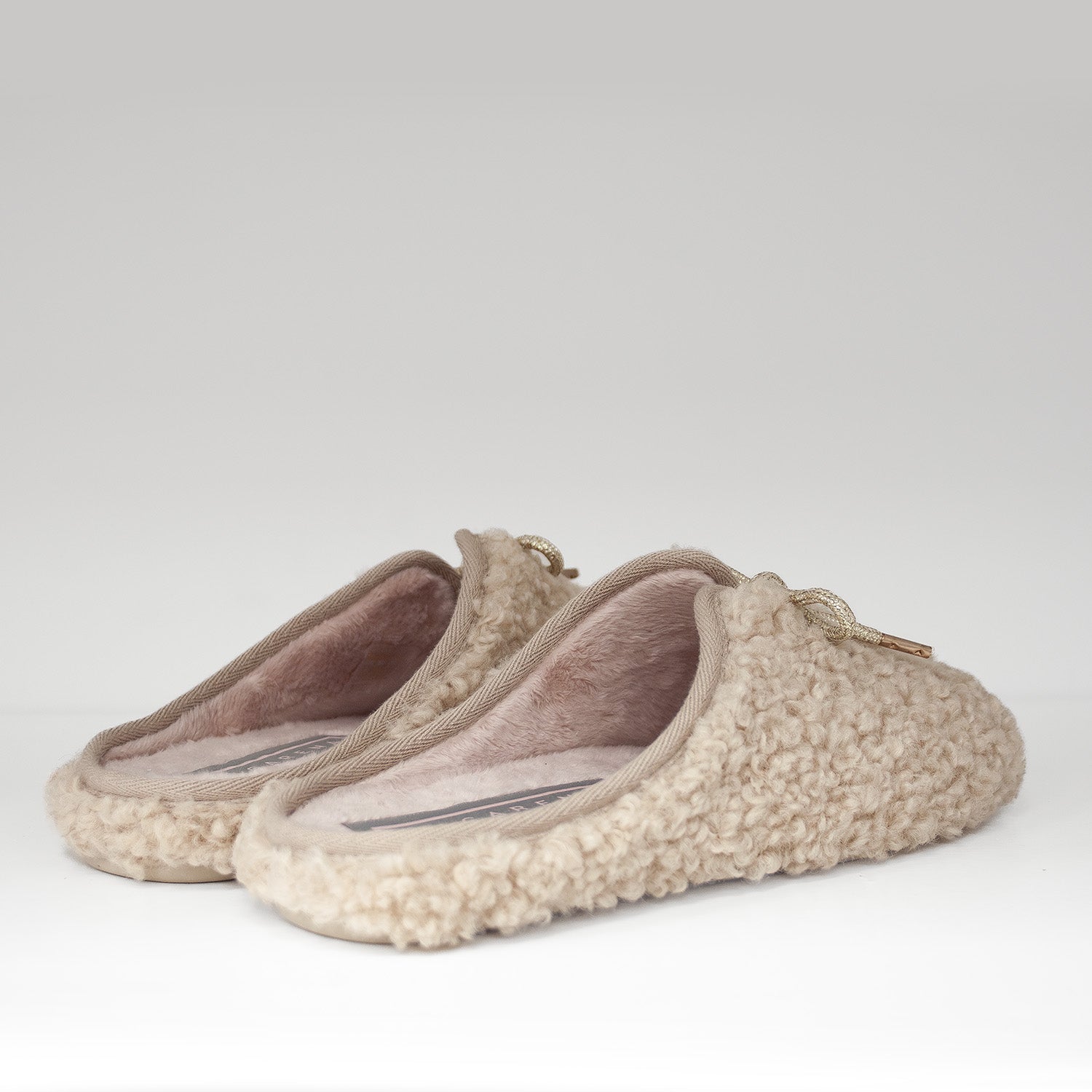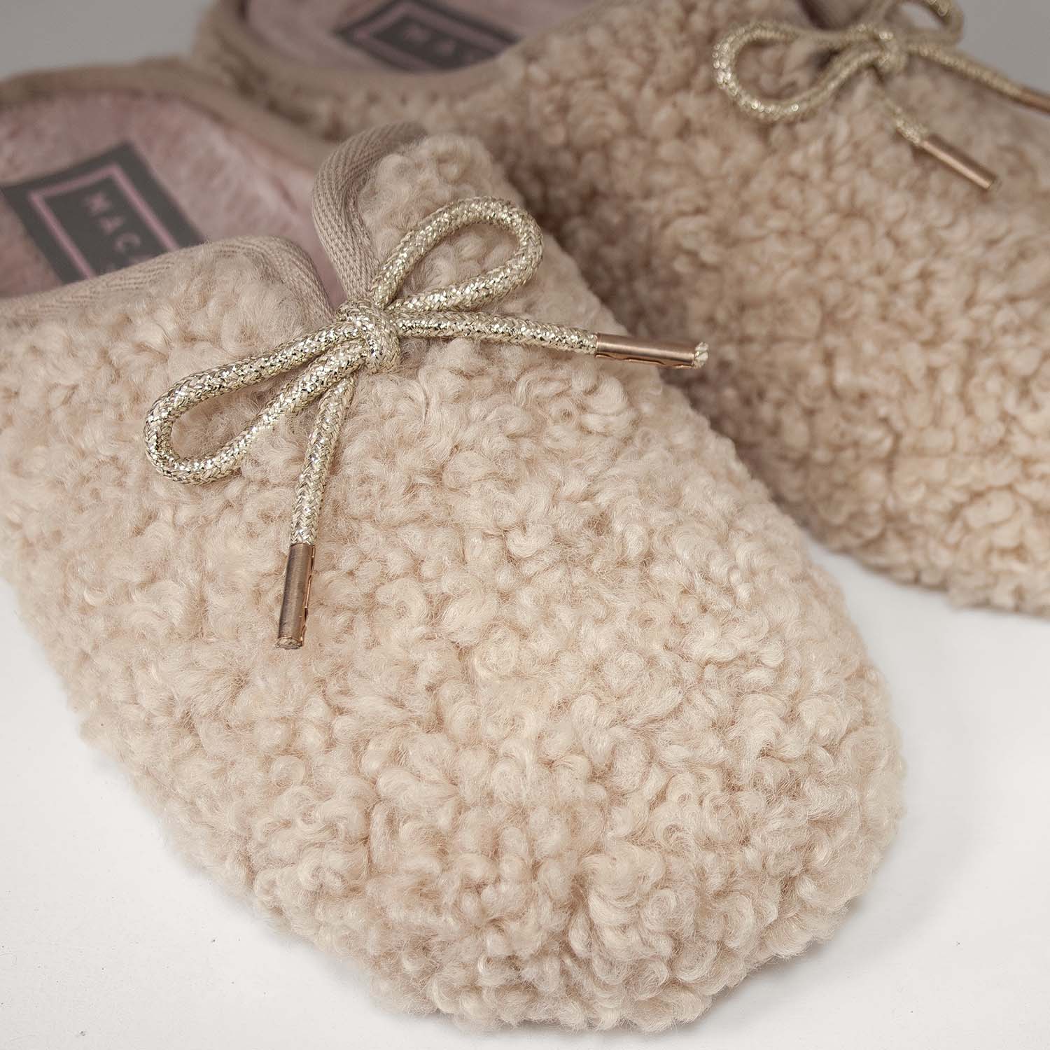 Kremowe kapcie Macarena wyróżniają się miękką, skrętną fakturą futerka, które przyjemnie otula stopę. Delikatna złota kokardka nadaje im subtelnego, eleganckiego akcentu. Wnętrze jest miękkie i przyjazne dla skóry, a lekka podeszwa zapewnia wygodę przy każdym kroku. To przytulne, stylowe kapcie idealne do domowego relaksu.