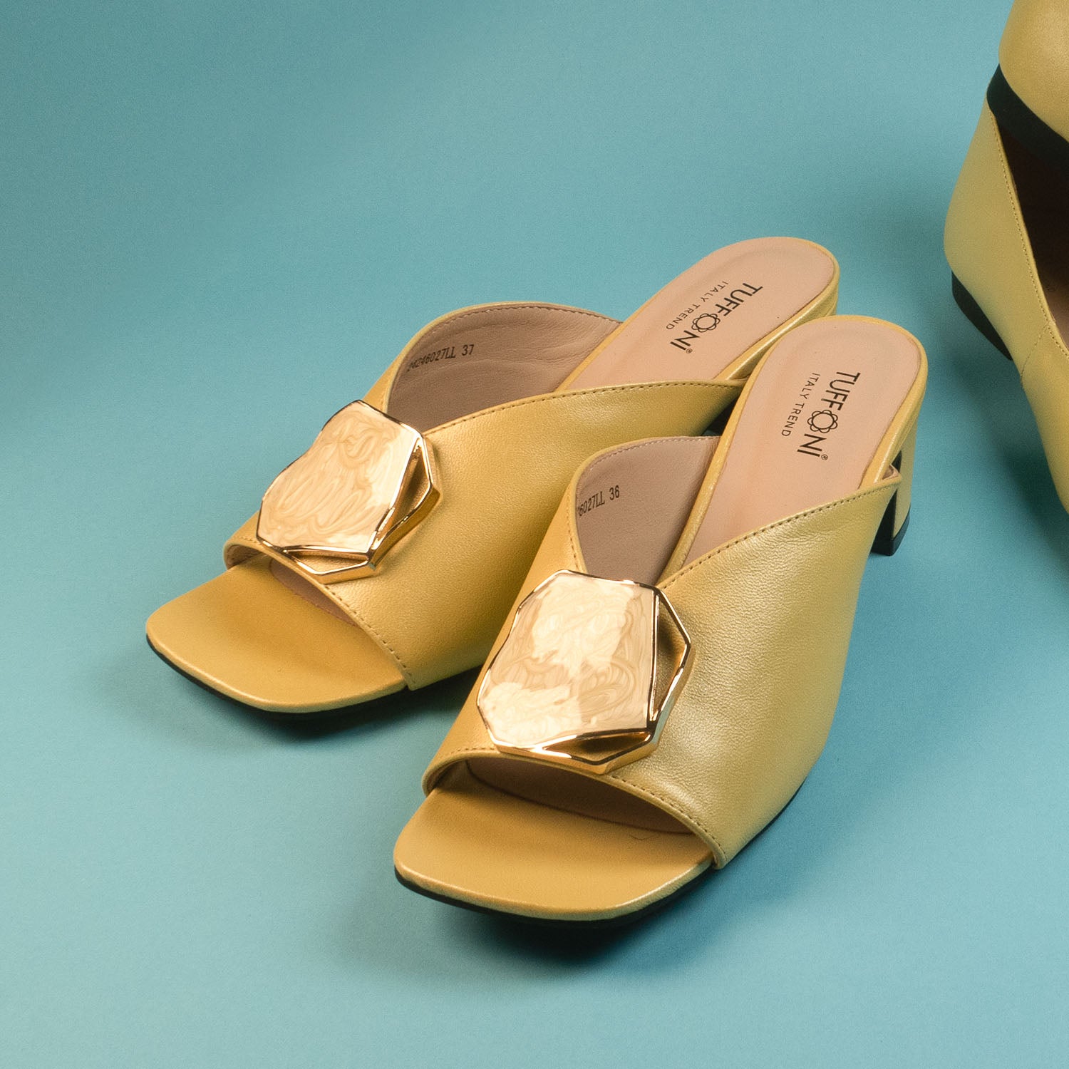 Klapki Tuffoni – żółte, skórzane, na obcasie