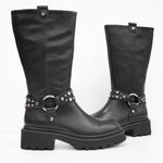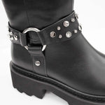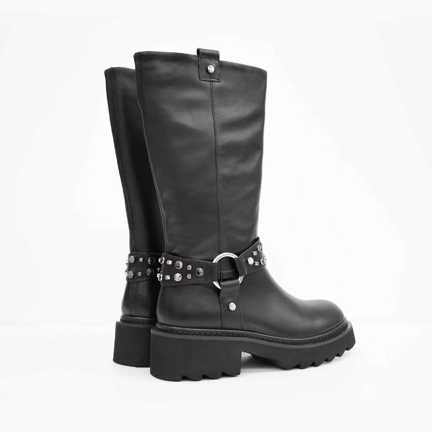 Czarne kozaki włoskiej marki Tosca Blu w motocyklowym stylu uszyte zostały z naturalnej skóry licowej. Wysoka cholewka z ozdobnym paskiem i metalowymi napami przyciąga spojrzenia, dodając całości rockowego akcentu. Szeroki obcas i solidna platforma z wyraźnym bieżnikiem zapewniają stabilność i wygodę podczas noszenia, a boczny zamek ułatwia zakładanie. Wnętrze z miękką, skórzaną wkładką i lekkim ociepleniem otula stopę w chłodniejsze dni. Idealne do zestawów z jeansami i krótką kurtką skórzaną.