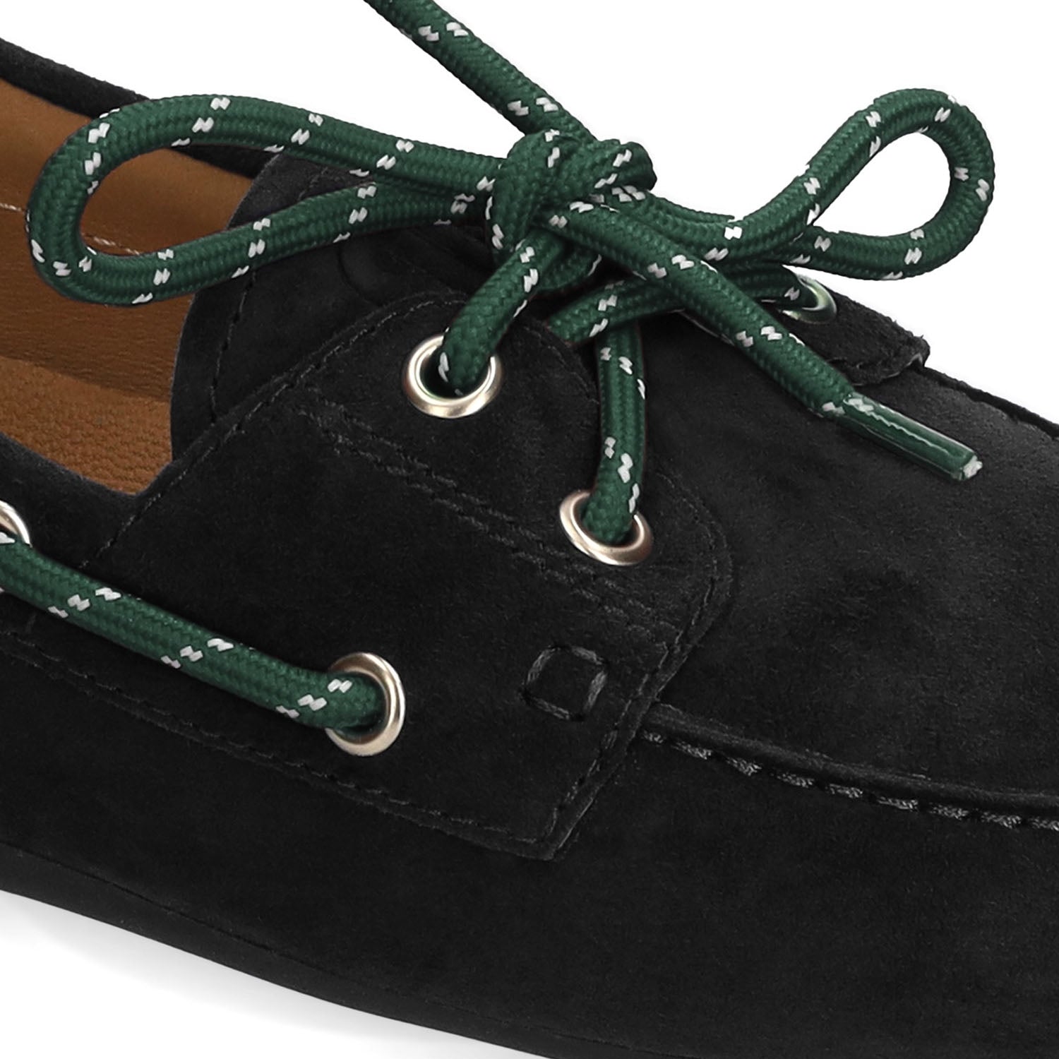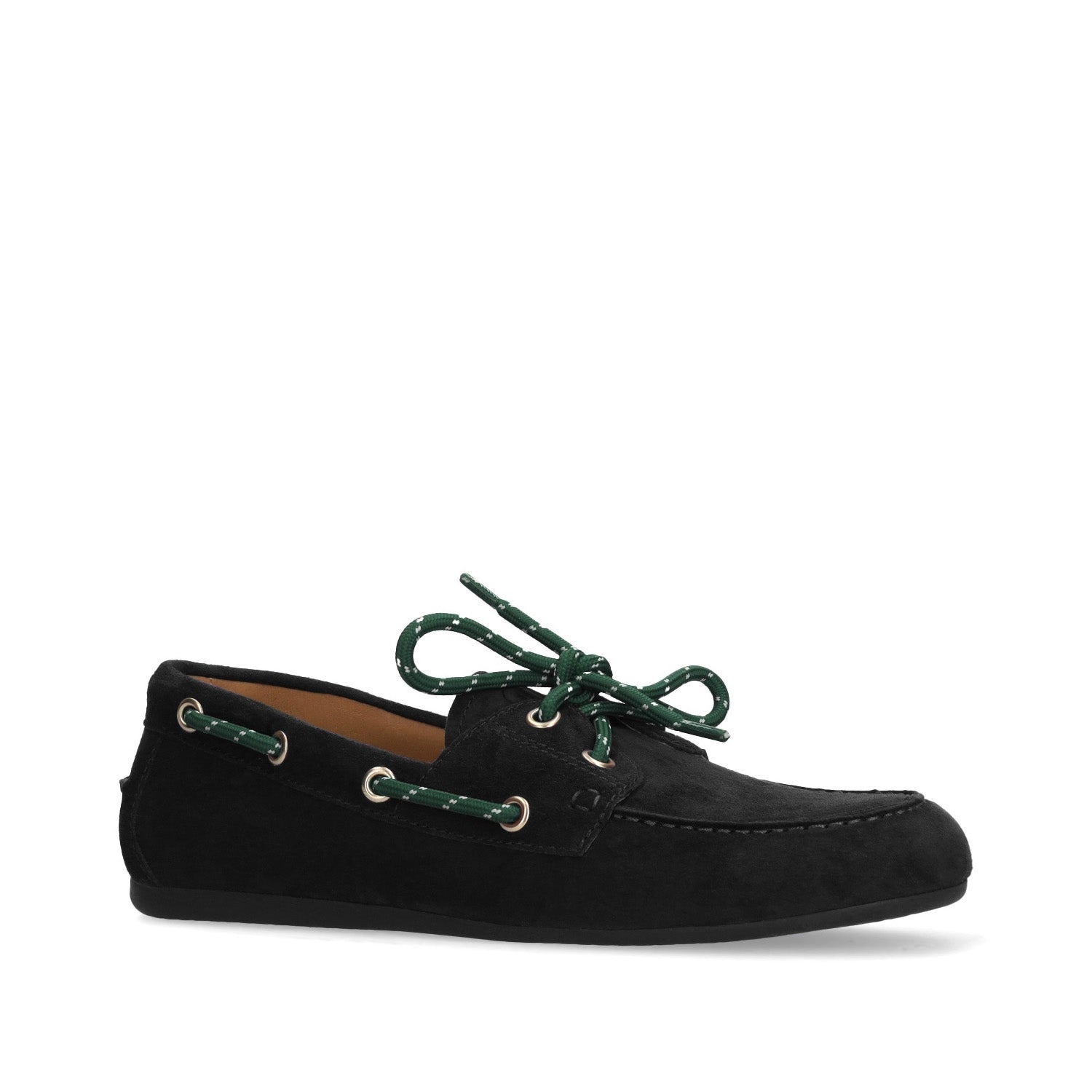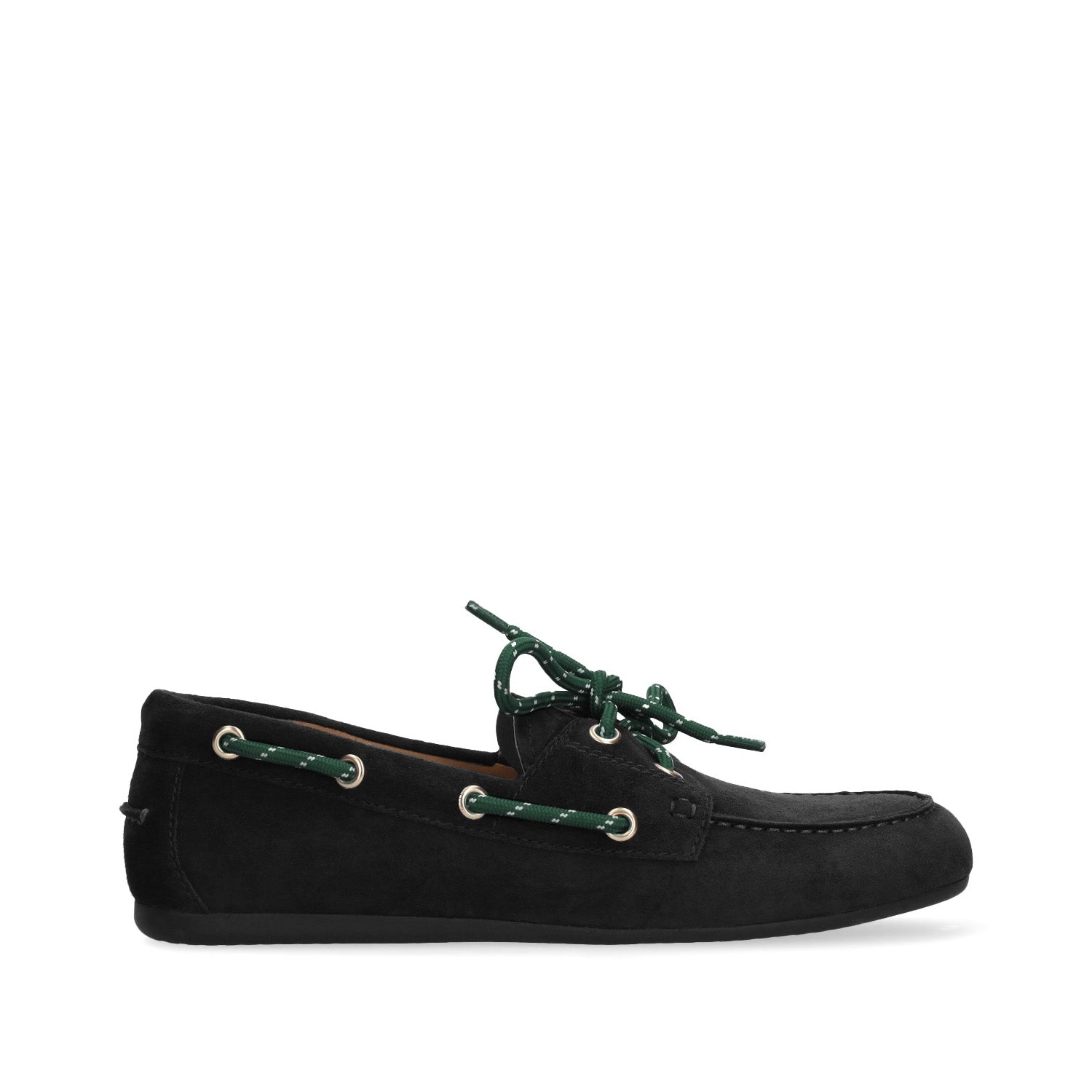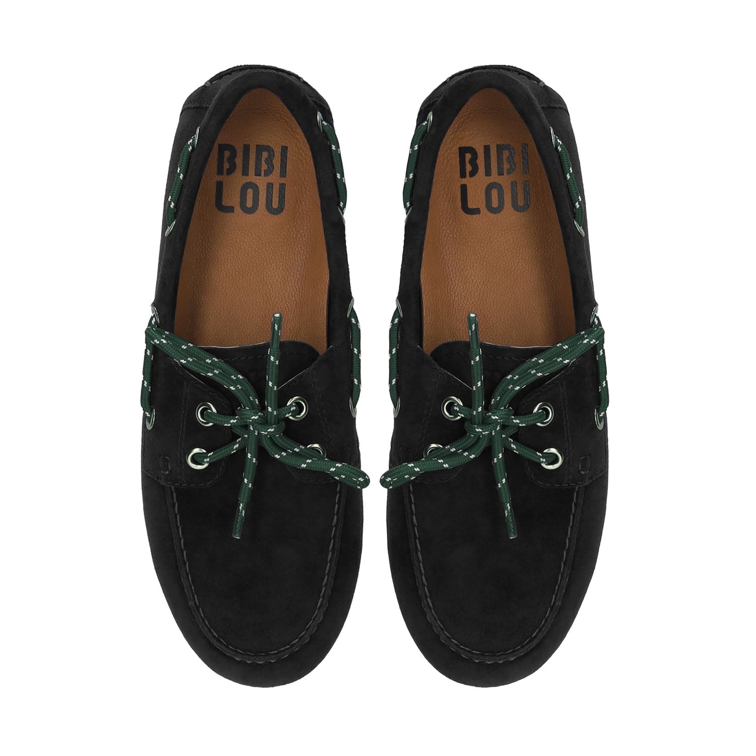 Czarne mokasyny hiszpańskiej marki Bibi Lou wykonane z miękkiego, naturalnego zamszu. Ich lekka, elastyczna podeszwa gwarantuje wygodę przez cały dzień, a klasyczna forma z okrągłym noskiem nadaje im subtelnej elegancji. Zielona sznurówka poprowadzona wzdłuż krawędzi cholewki dodaje butom charakteru i świeżości, przełamując głębię czerni oryginalnym akcentem. Wnętrze z delikatnej skóry otula stopę komfortem. Mokasyny Bibi Lou świetnie komponują się z lnianymi spodniami, białą koszulą lub sukienką w stylu casual chic.
