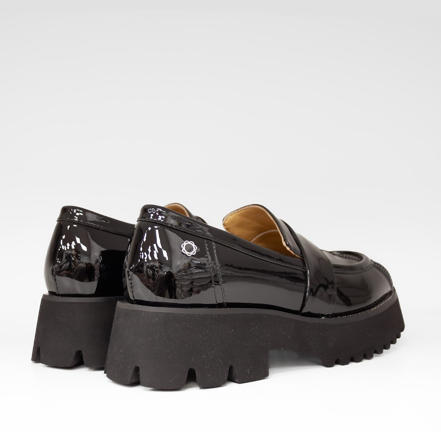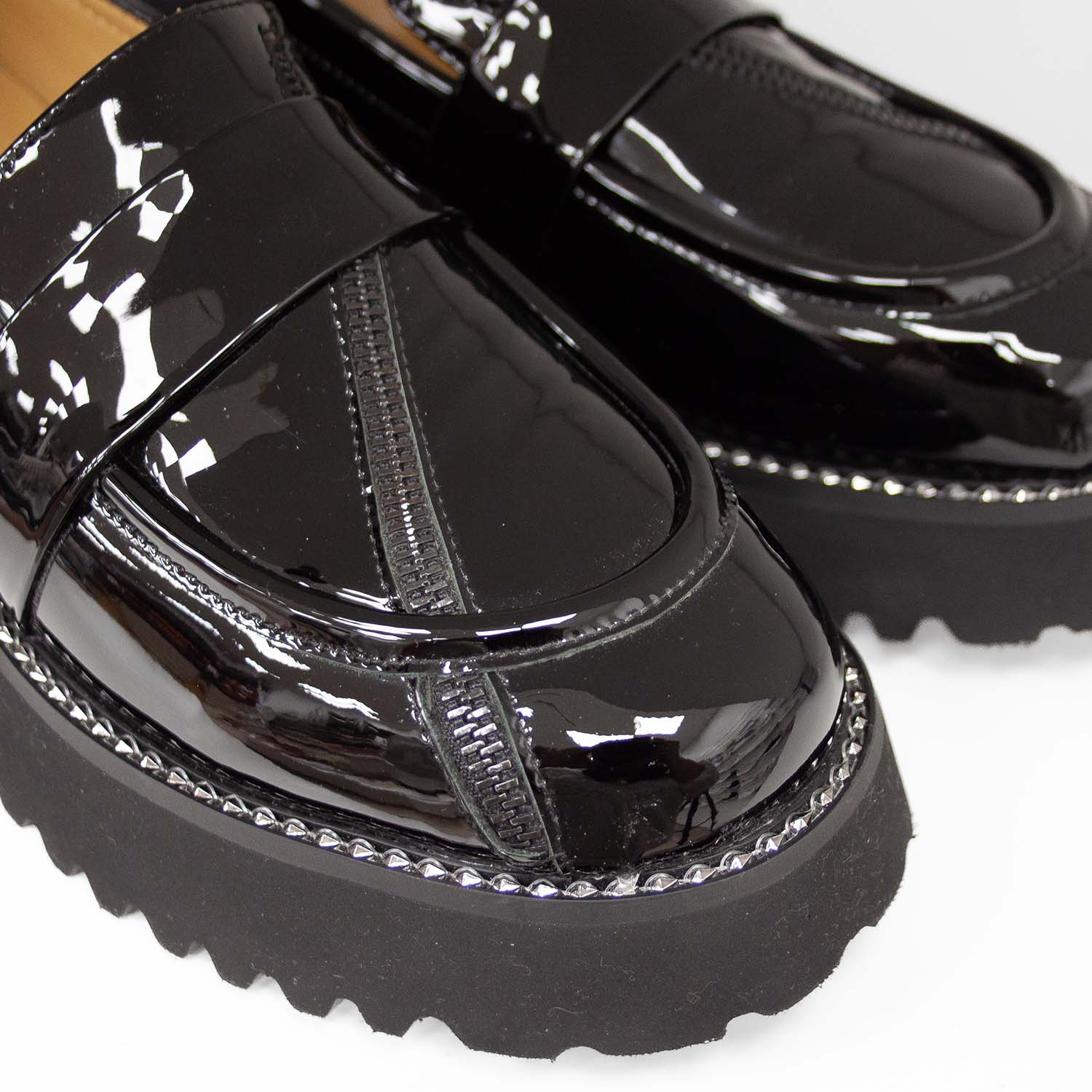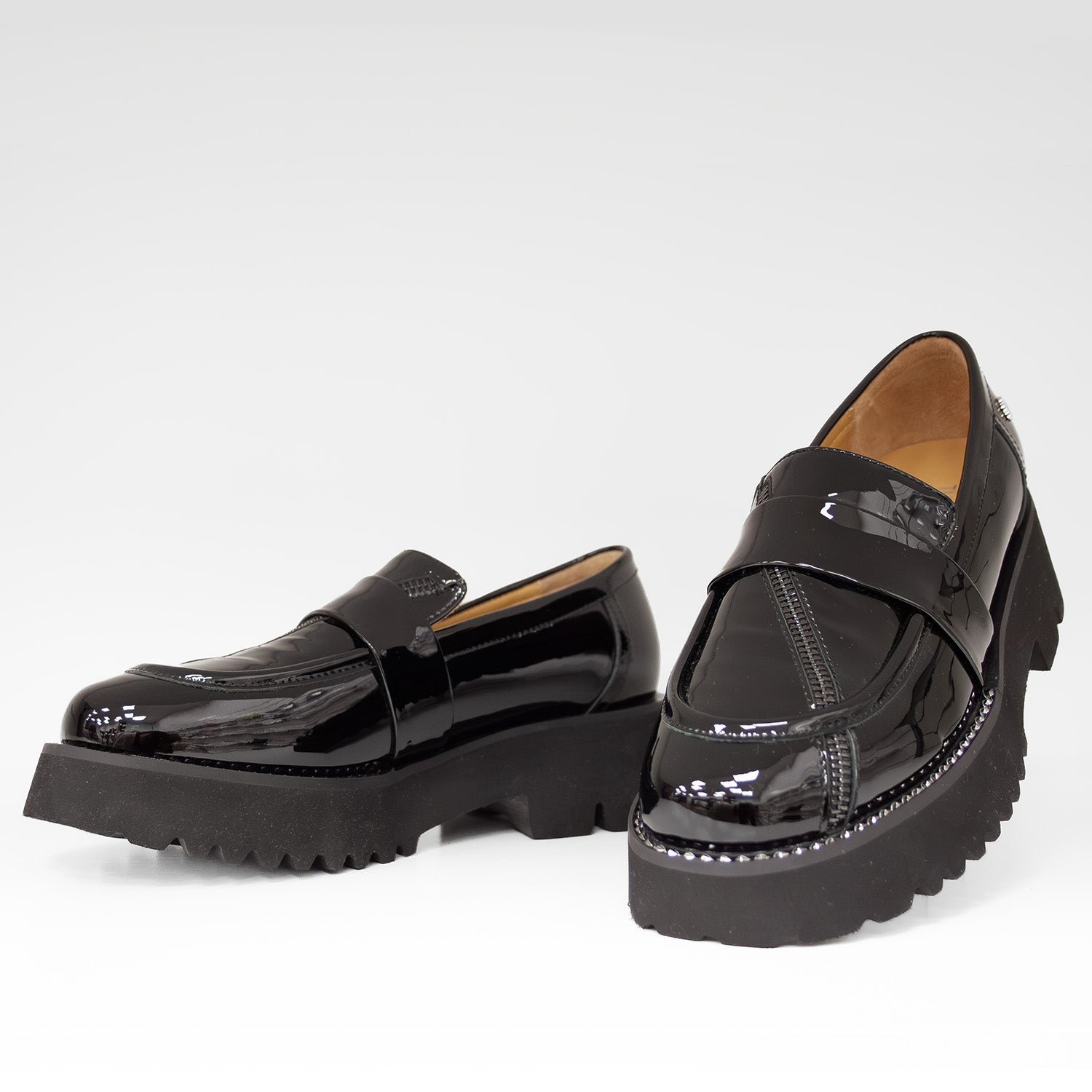 Czarne mokasyny Tuffoni wykonane z lakierowanej skóry naturalnej przyciągają uwagę lśniącą powierzchnią i perfekcyjnym włoskim wykończeniem. Smukły fason z klasycznym językiem i precyzyjnym przeszyciem podkreśla elegancję, a połysk dodaje wyrazistości. Na cholewce umieszczono subtelny ozdobny zamek, a przód podeszwy zdobi delikatny łańcuszek. Lekka platforma z pianki EVA nadaje im nowoczesny wygląd i zapewnia wyjątkowy komfort przy każdym kroku. To mokasyny, które świetnie odnajdą się zarówno w biurowym dress codzie, jak i w miejskich stylizacjach z szerokimi spodniami czy czarnym trenczem.