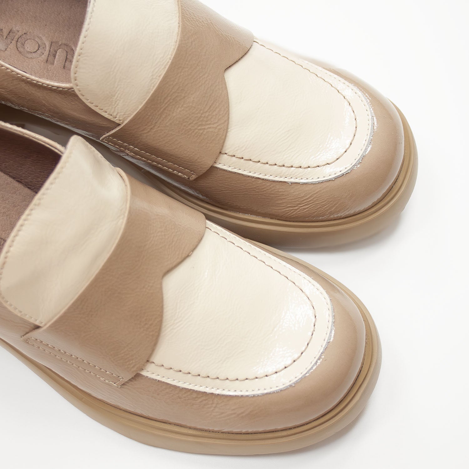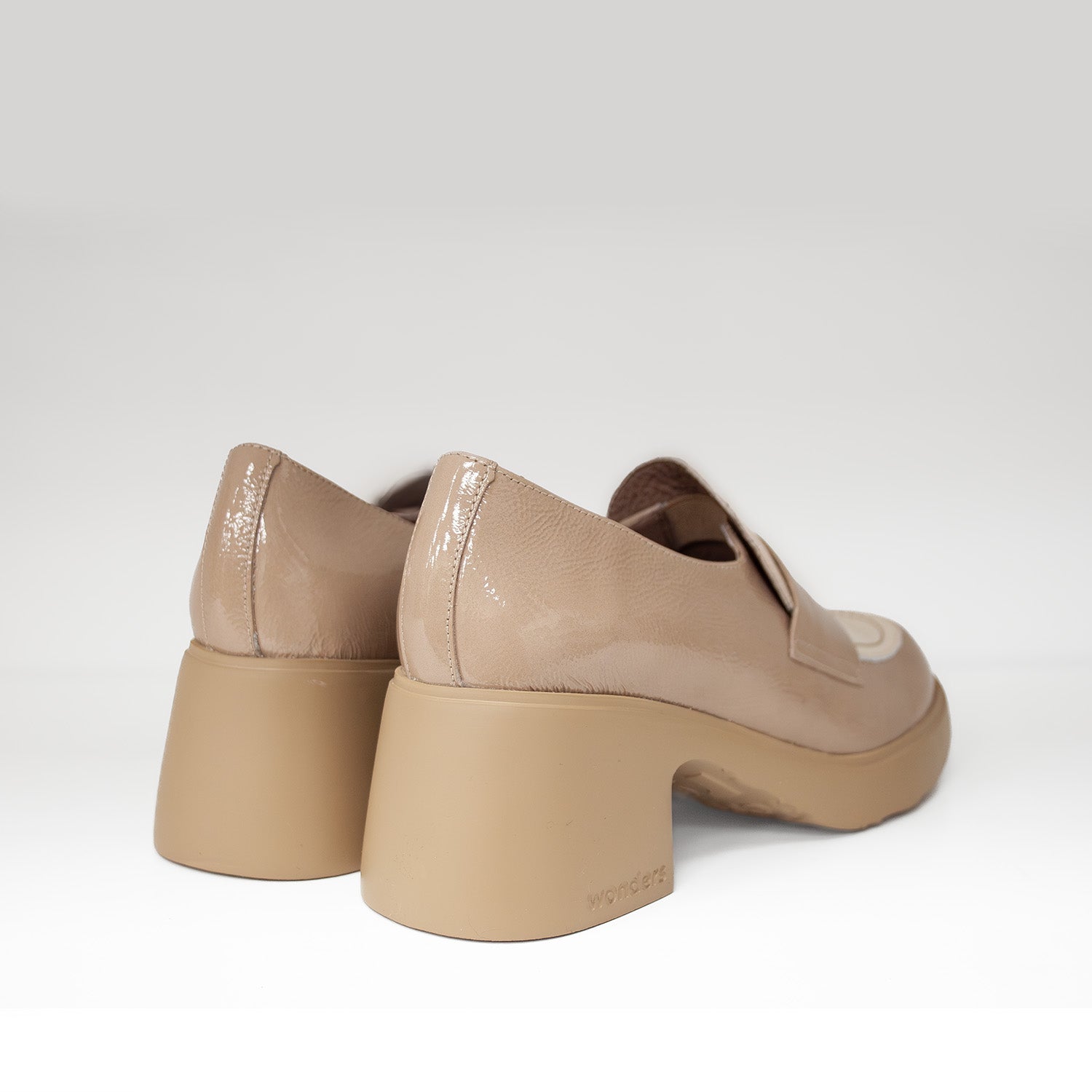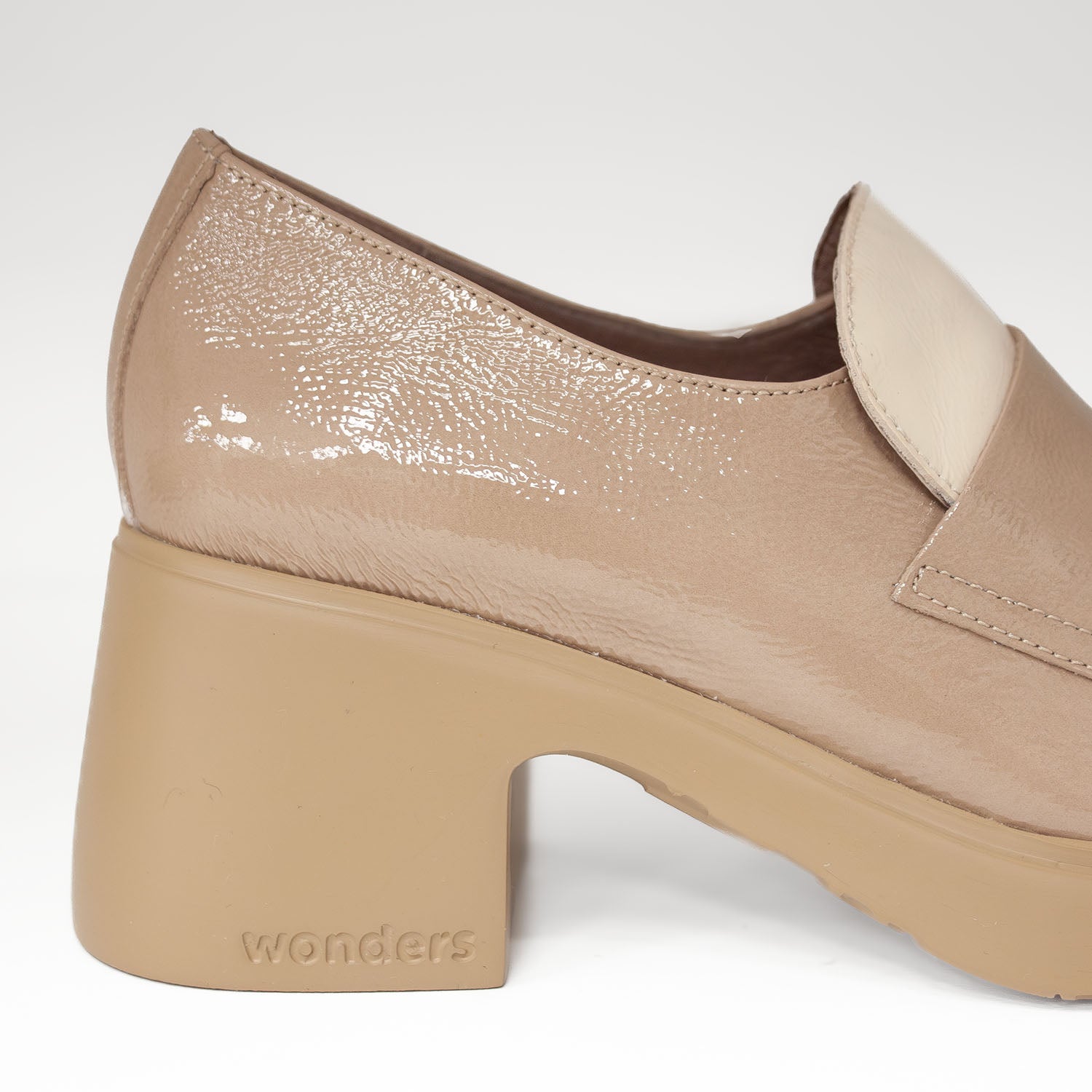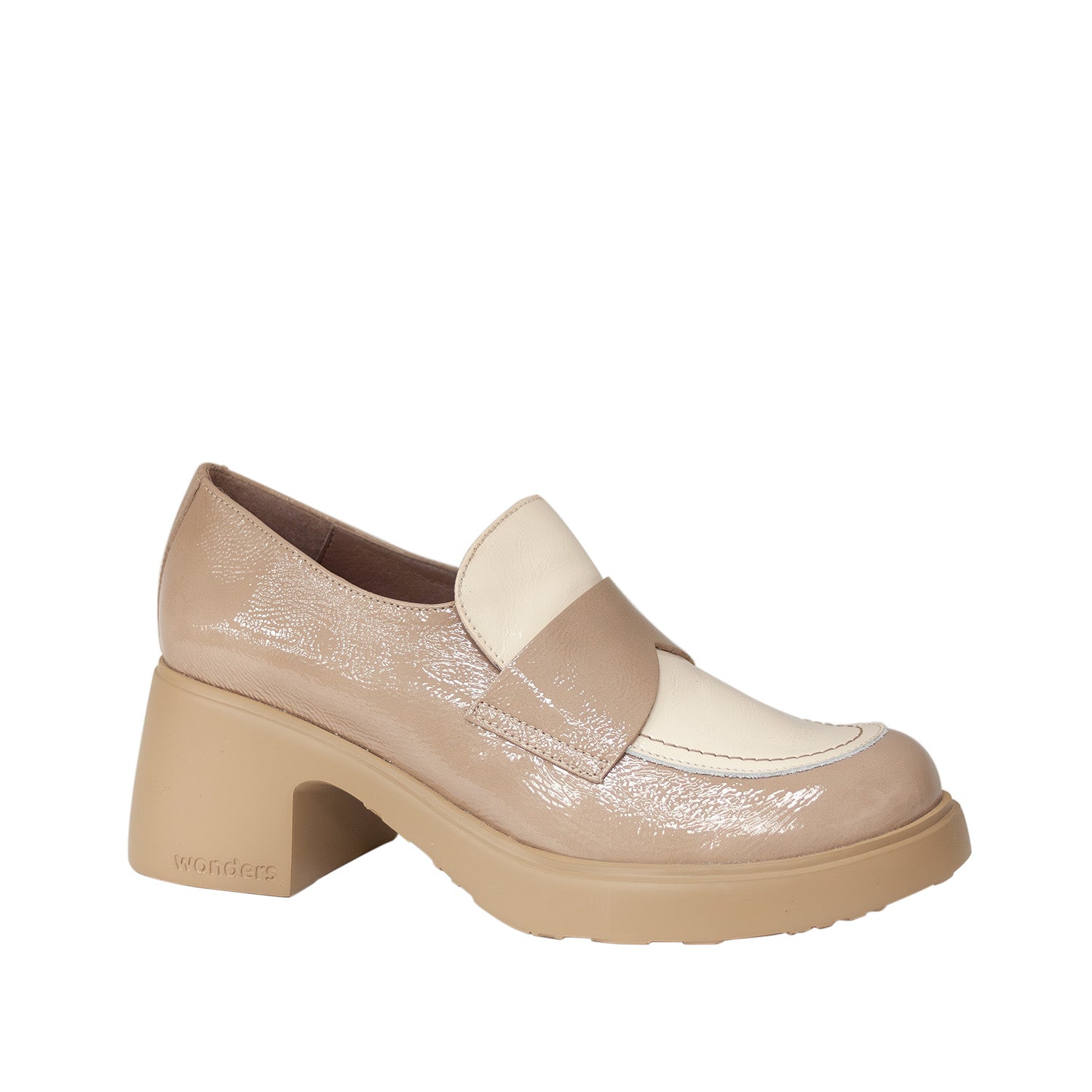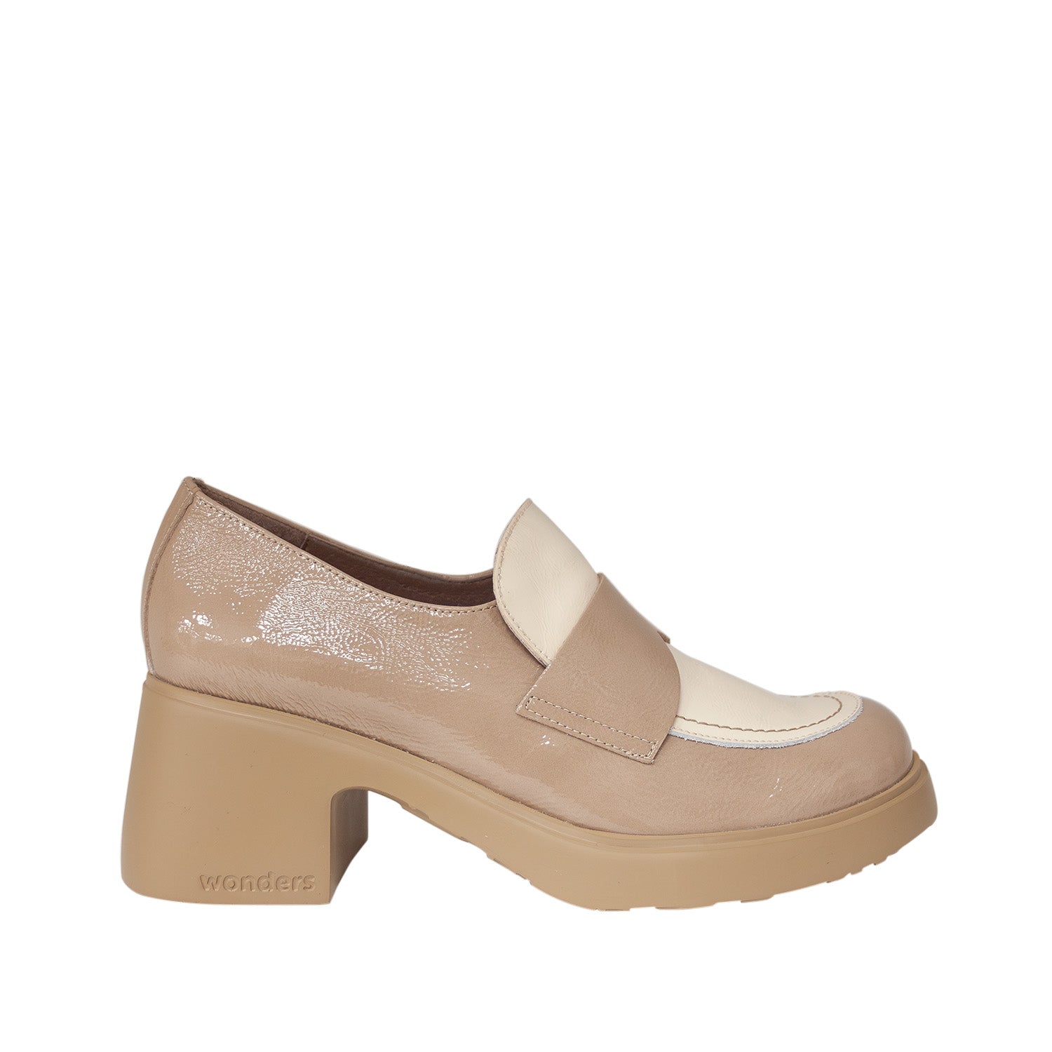 Beżowe mokasyny hiszpańskiej marki Wonders wykonane z lakierowanej skóry naturalnej przyciągają uwagę subtelnym połyskiem i nowoczesną formą. Dwukolorowa cholewka w odcieniach kremu i beżu nadaje im lekkości i oryginalnego charakteru. Stabilny, szeroki obcas gwarantuje wygodę na co dzień, a miękka wkładka MemoryGel dopasowuje się do kształtu stopy, zapewniając wyjątkowy komfort. To eleganckie mokasyny, które pięknie prezentują się w zestawie z klasycznymi spodniami, prostą sukienką lub jasnym garniturem – idealne na miejskie dni i spotkania w dobrym stylu.