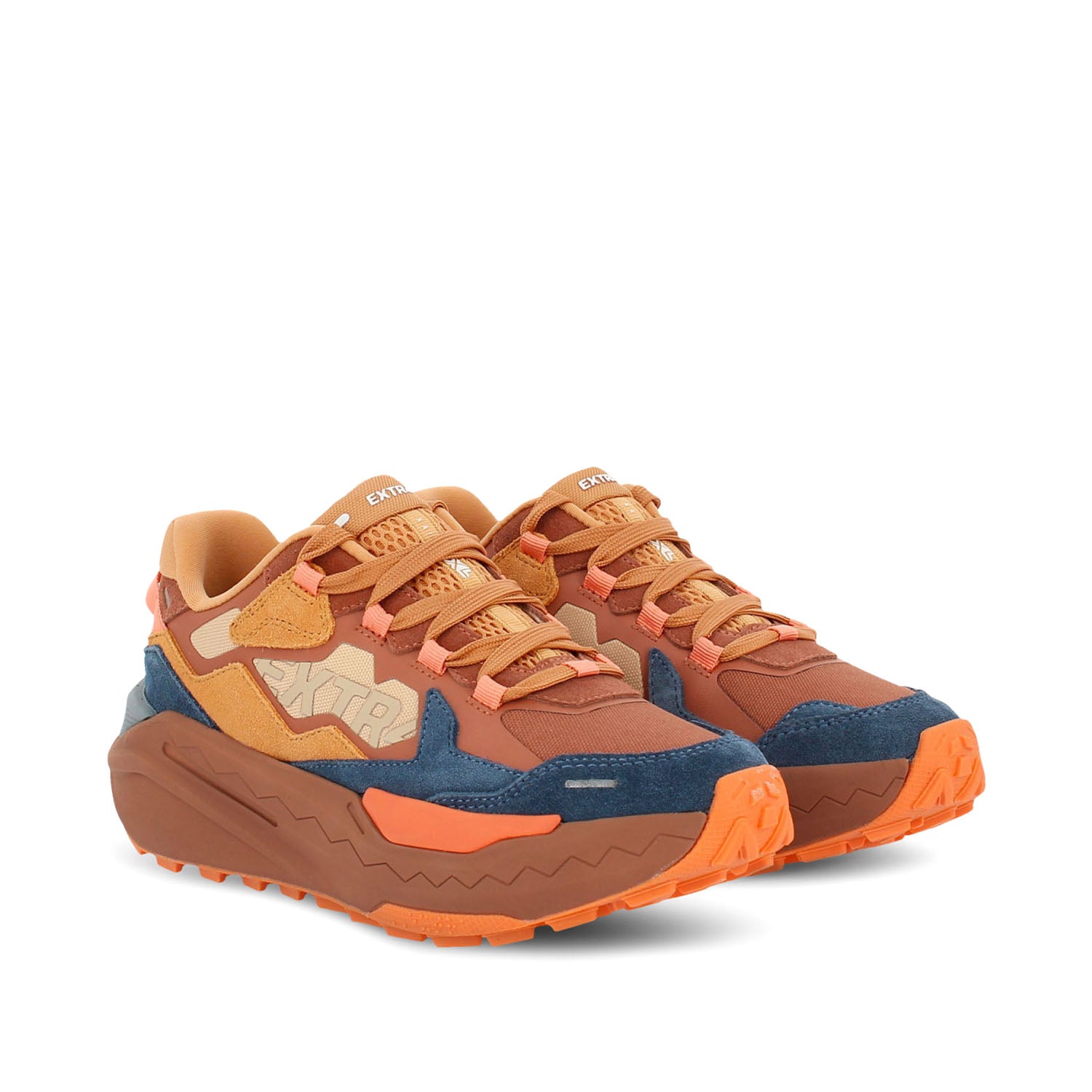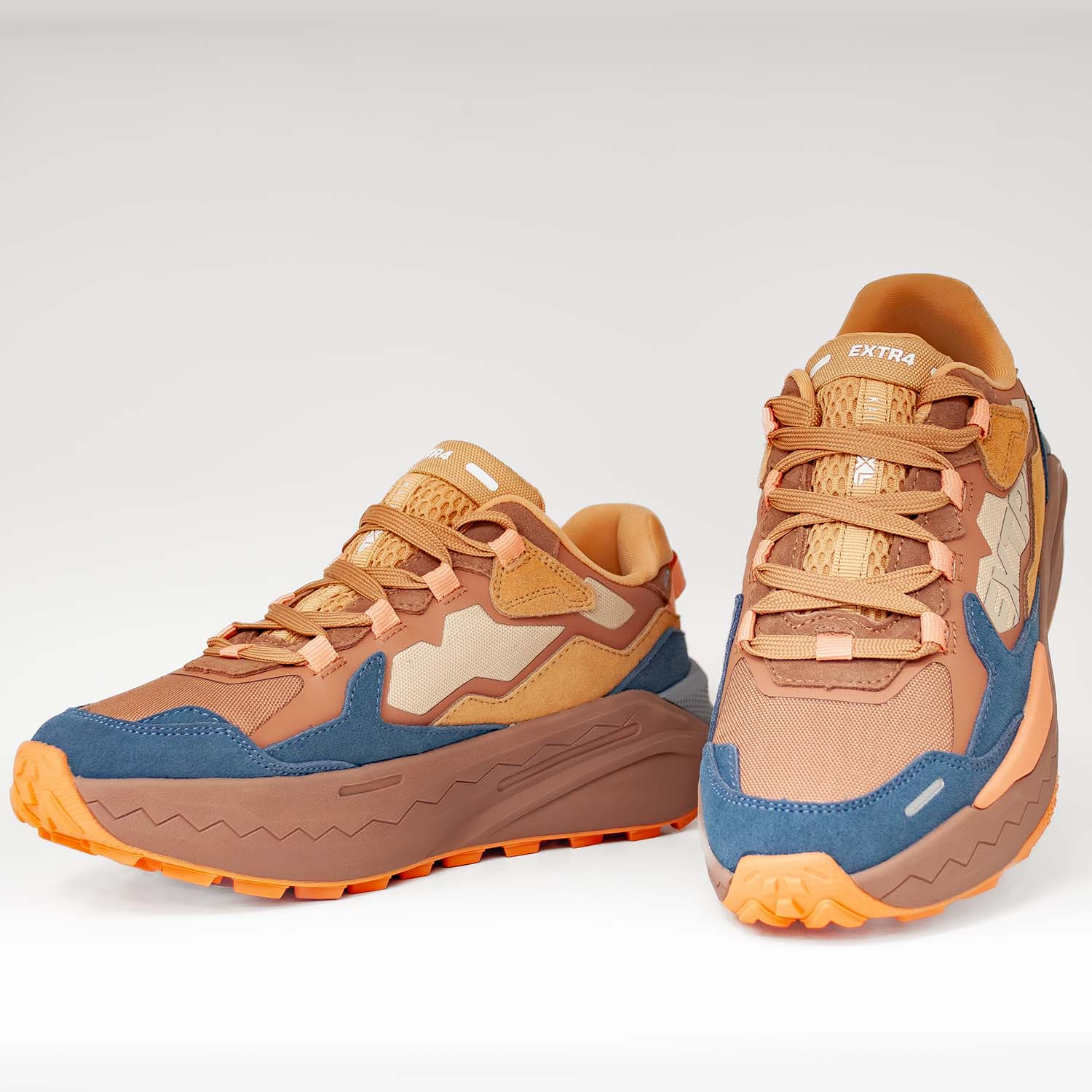 Sneakersy damskie EXTR4 w odcieniach brązu i błękitu z wyrazistymi, pomarańczowymi akcentami to model stworzony dla kobiet ceniących wygodę i niebanalny styl. Cholewka wykonana z połączenia tkaniny technicznej i naturalnego zamszu gwarantuje trwałość i przyjemne dopasowanie. Wkładka Rapid-Tech z pianką EVA amortyzuje każdy krok, a pięciostrefowa podeszwa z bieżnikiem V-shape zapewnia doskonałą przyczepność i stabilność. To sneakersy, które podkreślą sportowy charakter stylizacji i świetnie sprawdzą się w miejskiej aktywności.