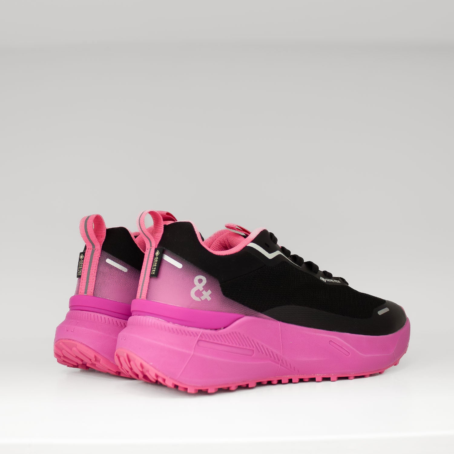 Sportowe sneakersy włoskiej marki EXTR4 w czerni z wyrazistymi różowymi detalami wykonane są z wodoodpornego materiału z membraną GORE-TEX Invisible Fit, która chroni przed wilgocią i pozwala stopie oddychać. Miękki kołnierz i język zwiększają wygodę noszenia, a wkładka Rapid-Tech z pianką EVA amortyzuje każdy krok. Stabilna, antypoślizgowa podeszwa z gumowym bieżnikiem zapewnia pewny krok i dobrą przyczepność. To dynamiczny model, który świetnie sprawdzi się w codziennym użytkowaniu i doda energii sportowym stylizacjom.