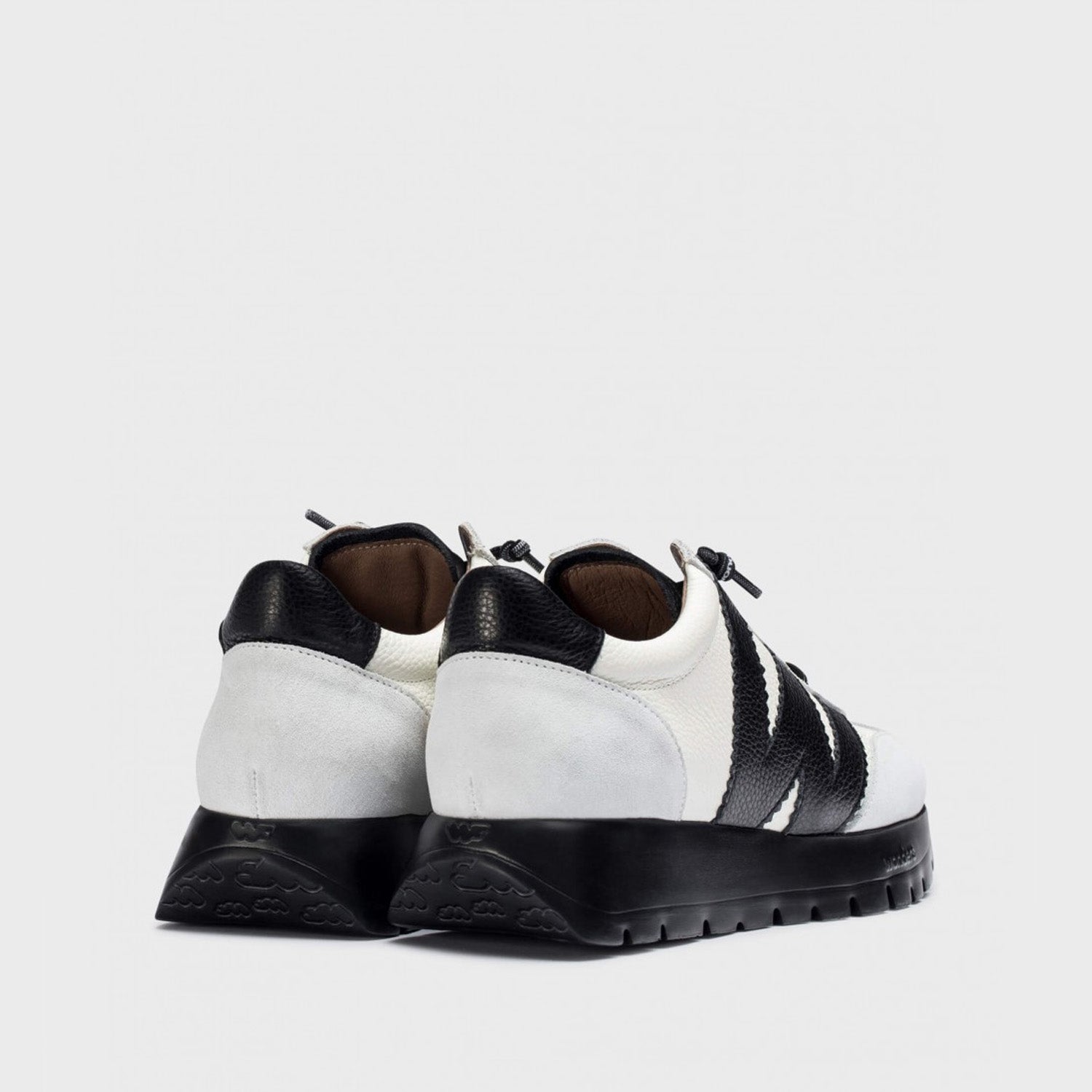 Biało-czarne sneakersy hiszpańskiej marki Wonders to wyrazisty model o eleganckim charakterze. Cholewka z najwyższej jakości naturalnej skóry licowej i zamszu tworzy elegancką bazę, którą uzupełnia czarna, miękka podeszwa WondersFly – lekka i sprężysta w codziennym ruchu. Czarny, kultowy już znak „W” podkreśla nowoczesny styl buta. Świetnie wyglądają w zestawieniu z szerokimi spodniami, minimalistyczną sukienką czy lnianą koszulą.