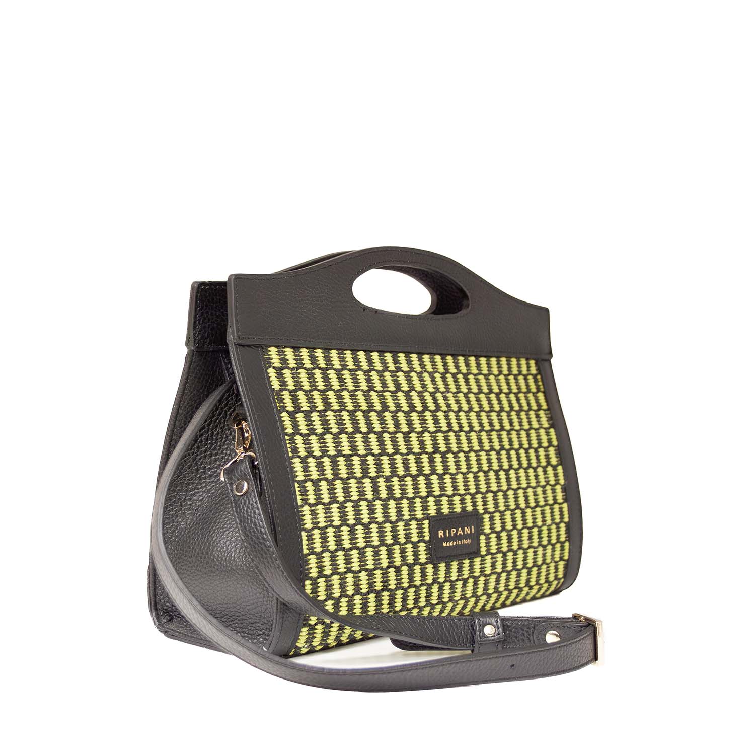 Zielona torebka Ripani typu kuferek zachwyca włoskim charakterem i nowoczesnym akcentem kolorystycznym. Naturalna skóra licowa została zestawiona z barwioną rafią, tworząc wyrazistą fakturę w odcieniach czerni i limonki. Torebka ma wygodną, skórzaną rączkę oraz długi, regulowany pasek, dzięki czemu sprawdzi się zarówno w dłoni, jak i na ramieniu. Zapinana na zamek błyskawiczny, kryje wnętrze z podszewką i trzema kieszonkami, w tym jedną na suwak. To model dla kobiet ceniących elegancję z nutą nowoczesnej świeżości – idealny do miasta i pracy.