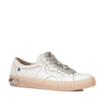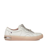 Włoskie trampki Tuffoni wykonane z białej, miękkiej skóry naturalnej to nowoczesny model z biżuteryjnym akcentem. Grube, srebrzyste sznurówki zdobią aplikacje w formie perełki i metalowego numeru, które przyciągają wzrok i nadają butom charakteru. Elastyczna platforma o wysokości 3 cm zapewnia wygodę, a miękka skórzana wyściółka dba o komfort stopy. Stylowy wybór do miejskich stylizacji z nutą nonszalancji i kobiecej elegancji.